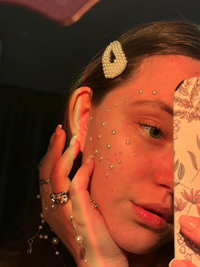 A close-up, angled portrait depicts the left side of an individual's face, likely a young adult female, partially obscured by a smartphone. The subject's left ear is visible, with a white, teardrop-sh…read more