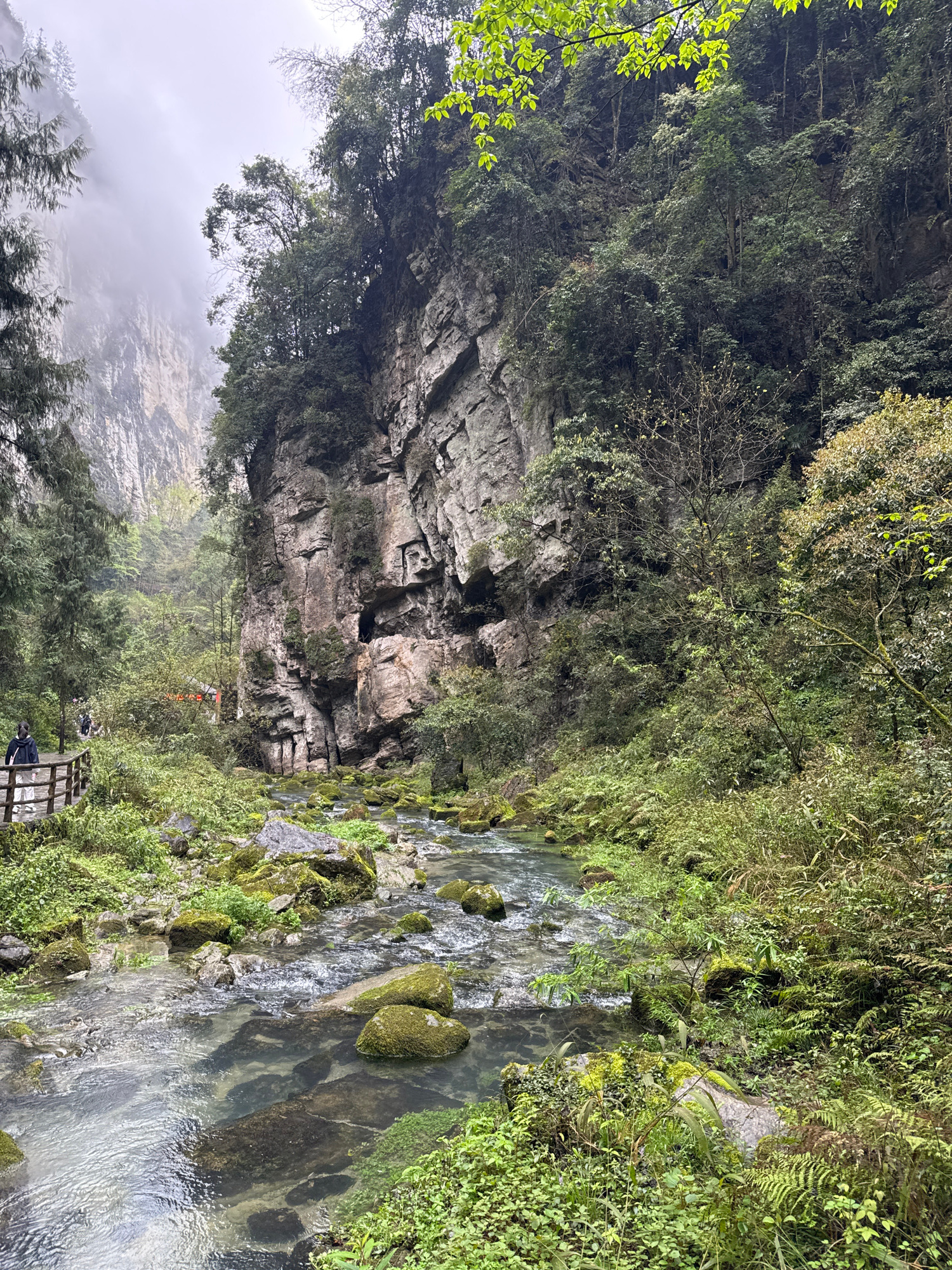 The image captures a scenic view in Wulong District, Chongqing, China. A clear stream flows through a lush, green environment with a steep rock face rising to the left. The rock face is covered with v…read more