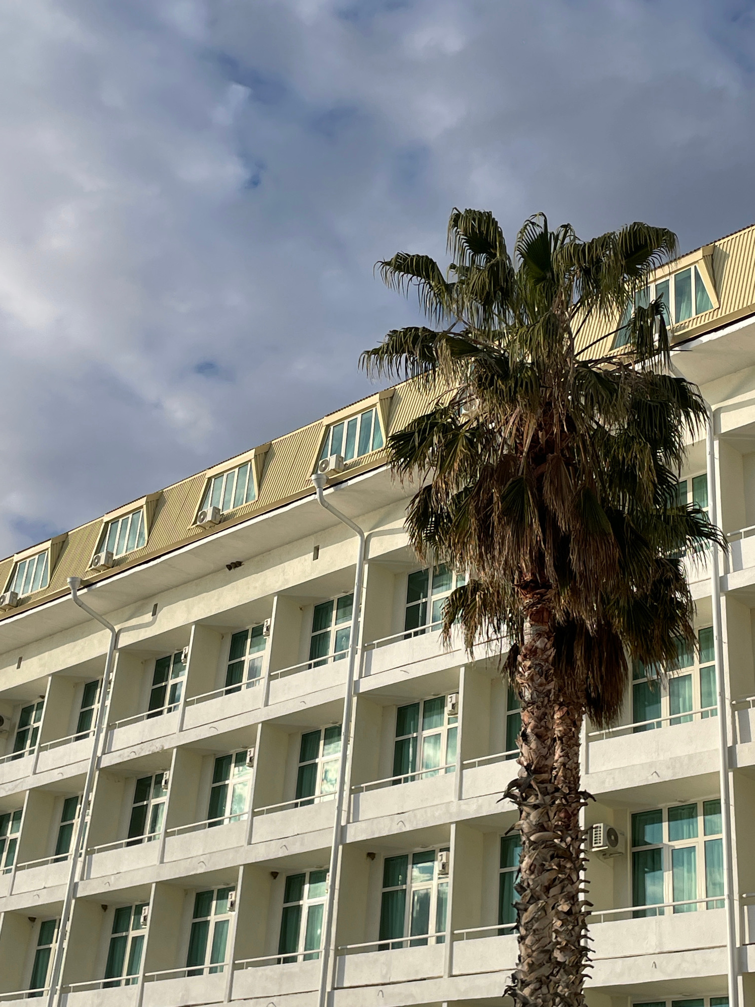 A low-angle shot shows a tall palm tree juxtaposed with a multi-story building. The sky, filled with patchy clouds, is visible in the left frame. The building features rows of windows and vertical arc…read more