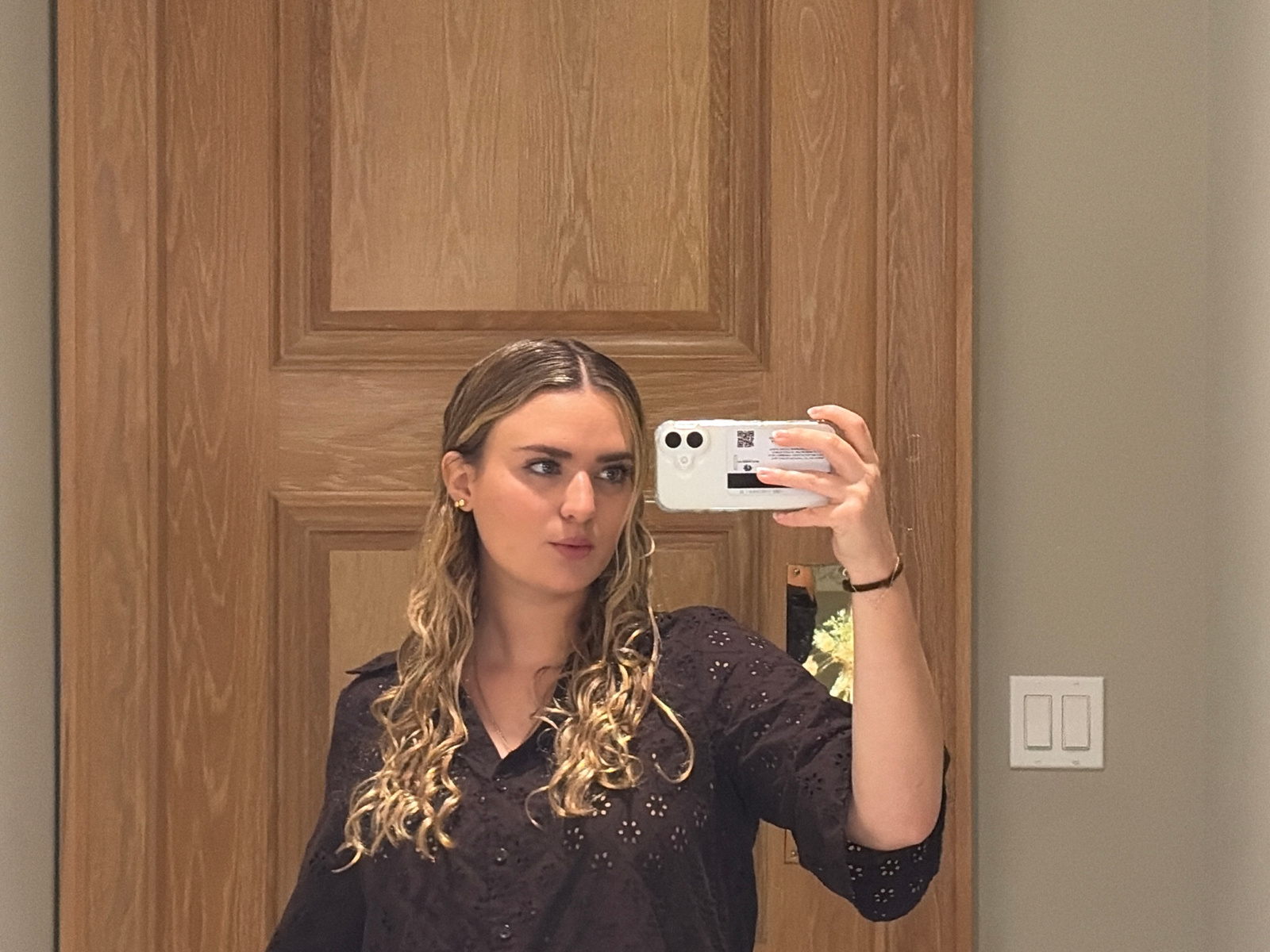 A young woman is taking a selfie in front of a wooden door. She is holding a white smartphone in her right hand, its screen facing away. The woman has blonde, curly hair, and is wearing a dark, eyelet…read more