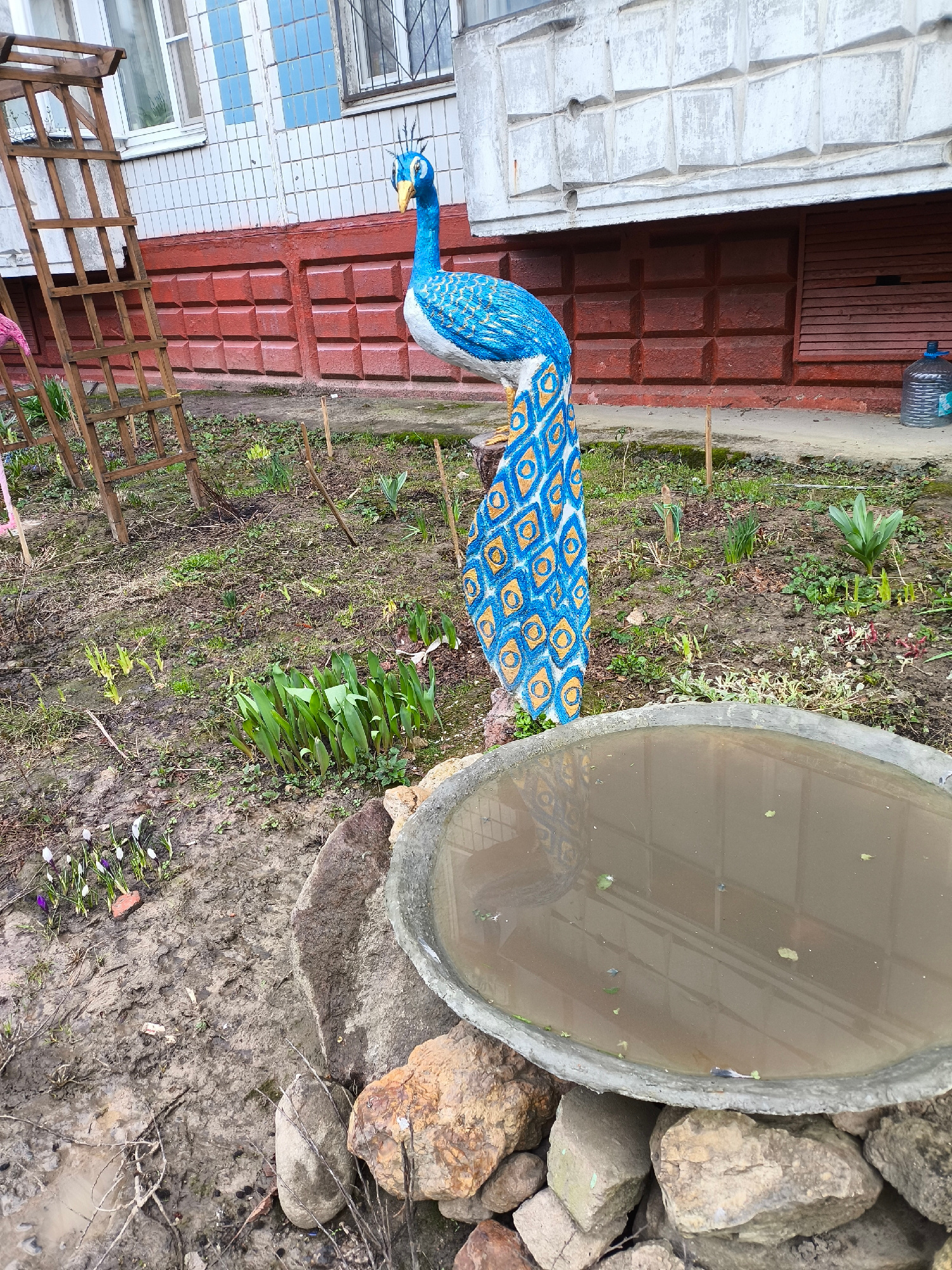 The image depicts a garden scene. A blue and white peacock statue stands prominently. Nearby is a birdbath filled with murky water, surrounded by rocks. Crocuses bloom on the muddy ground. A wooden tr…read more
