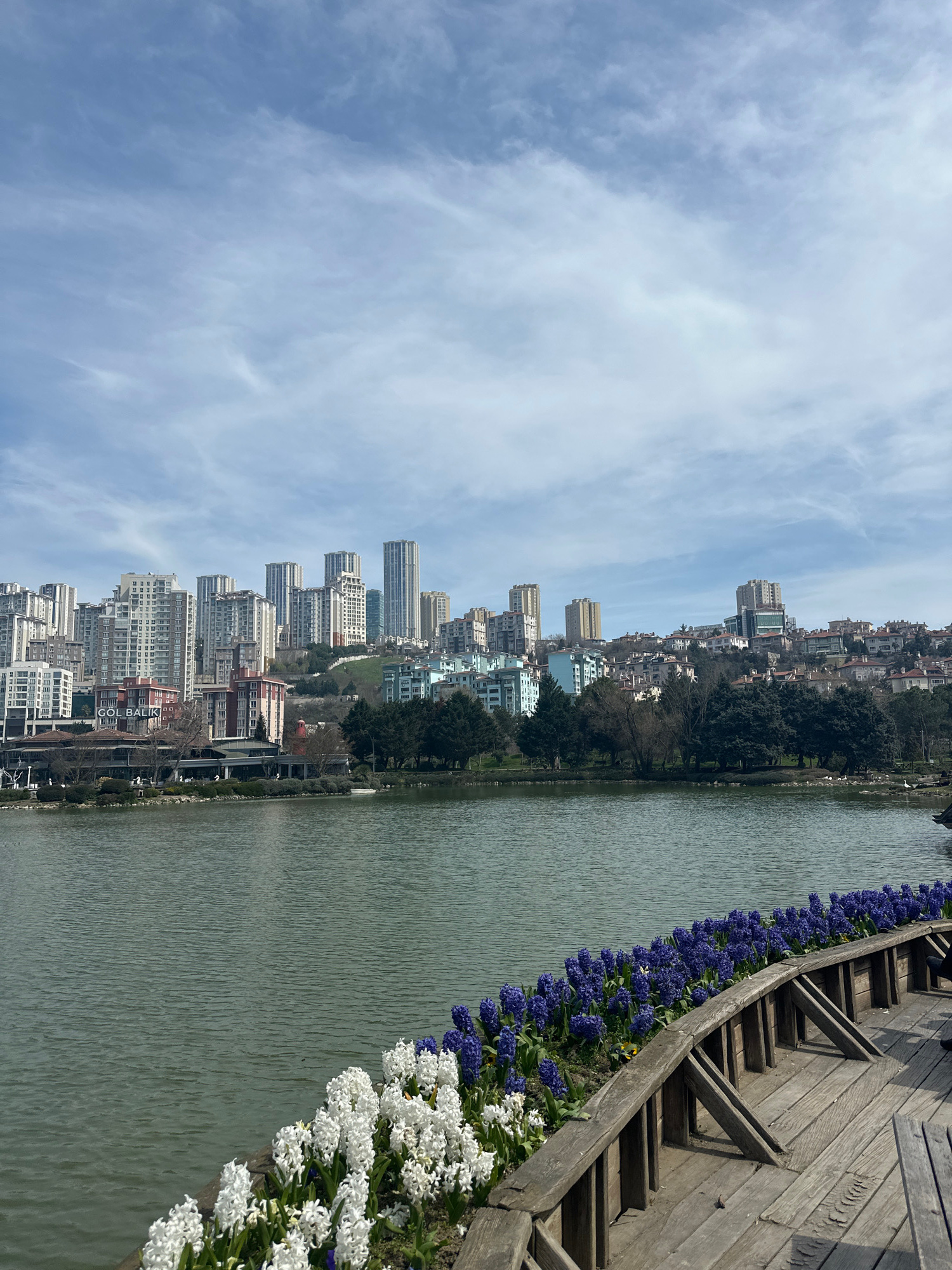 The scene depicts an outdoor landscape in Başakşehir, Turkey, overlooking Başakşehir Pond (Başakşehir Gölet) with the surrounding urban environment. In the immediate foreground, a wooden deck or walkw…read more