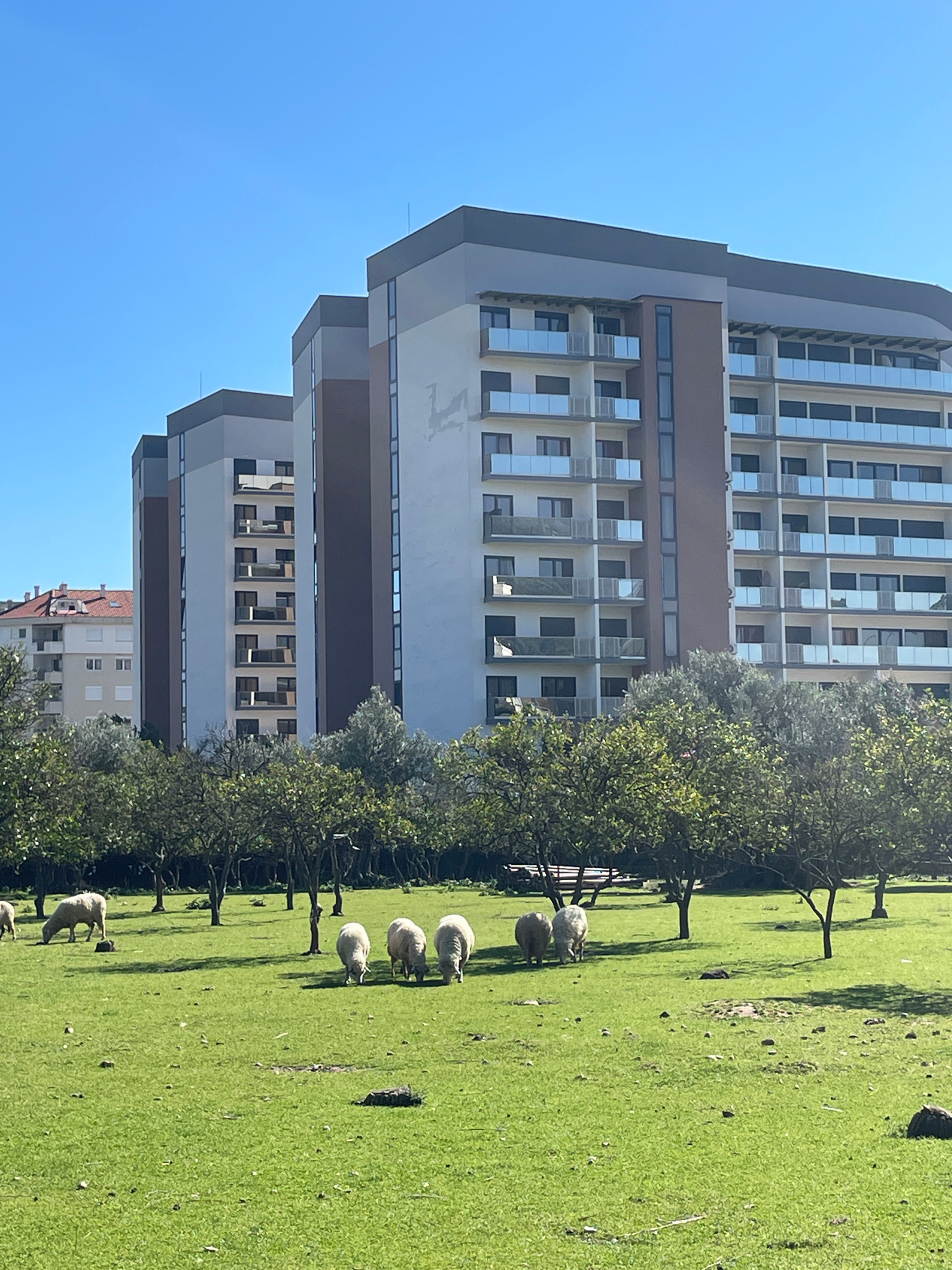 The image shows a scene in Bar, Montenegro, featuring a modern high-rise building adjacent to a grassy field where sheep are grazing. The building has a pale grey facade with multiple stories of windo…read more