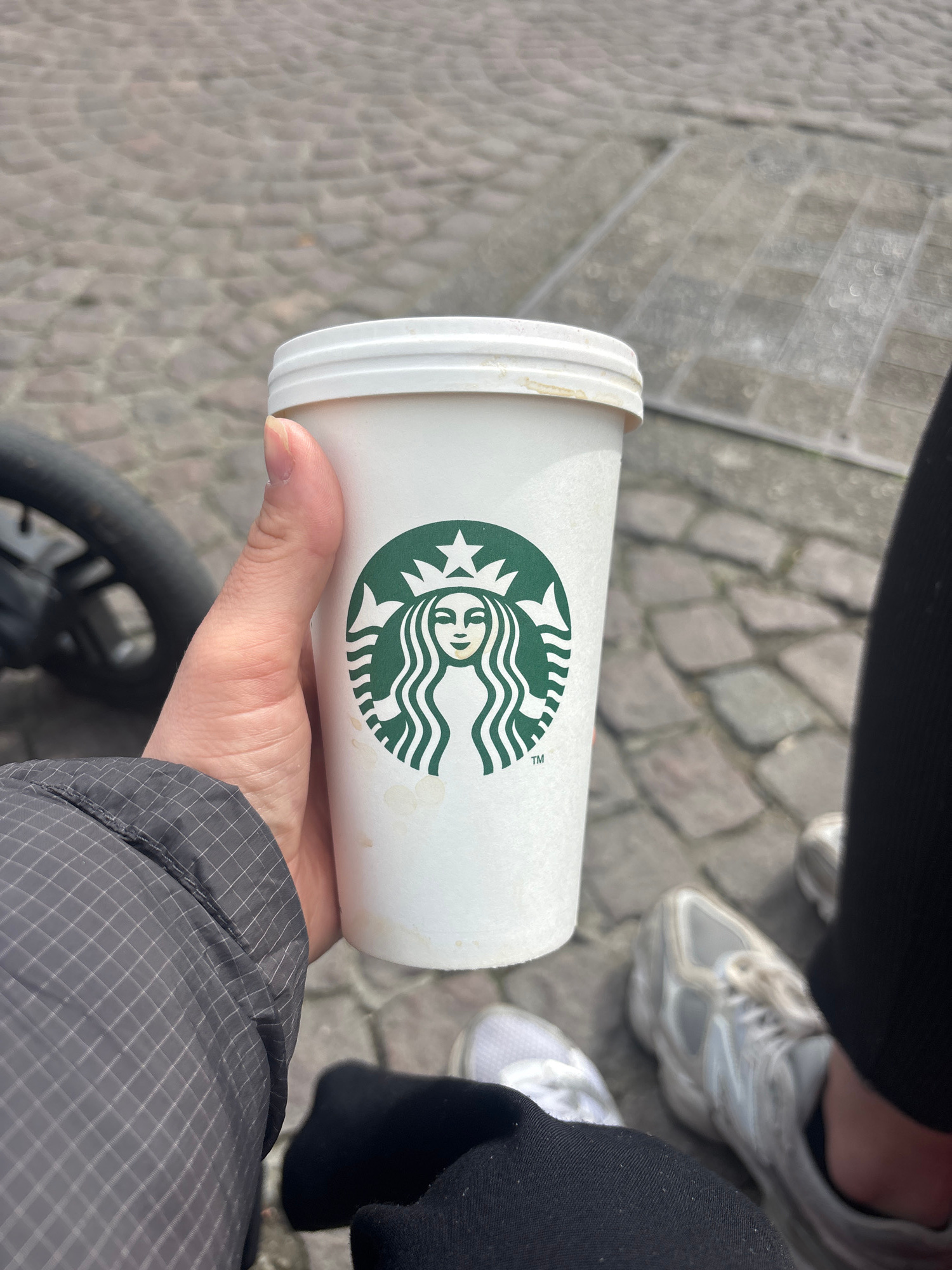 A person is holding a Starbucks coffee cup in their right hand. The cup is white with a green Starbucks logo. The person is wearing a gray quilted jacket. The background is a cobblestone street. In th…read more