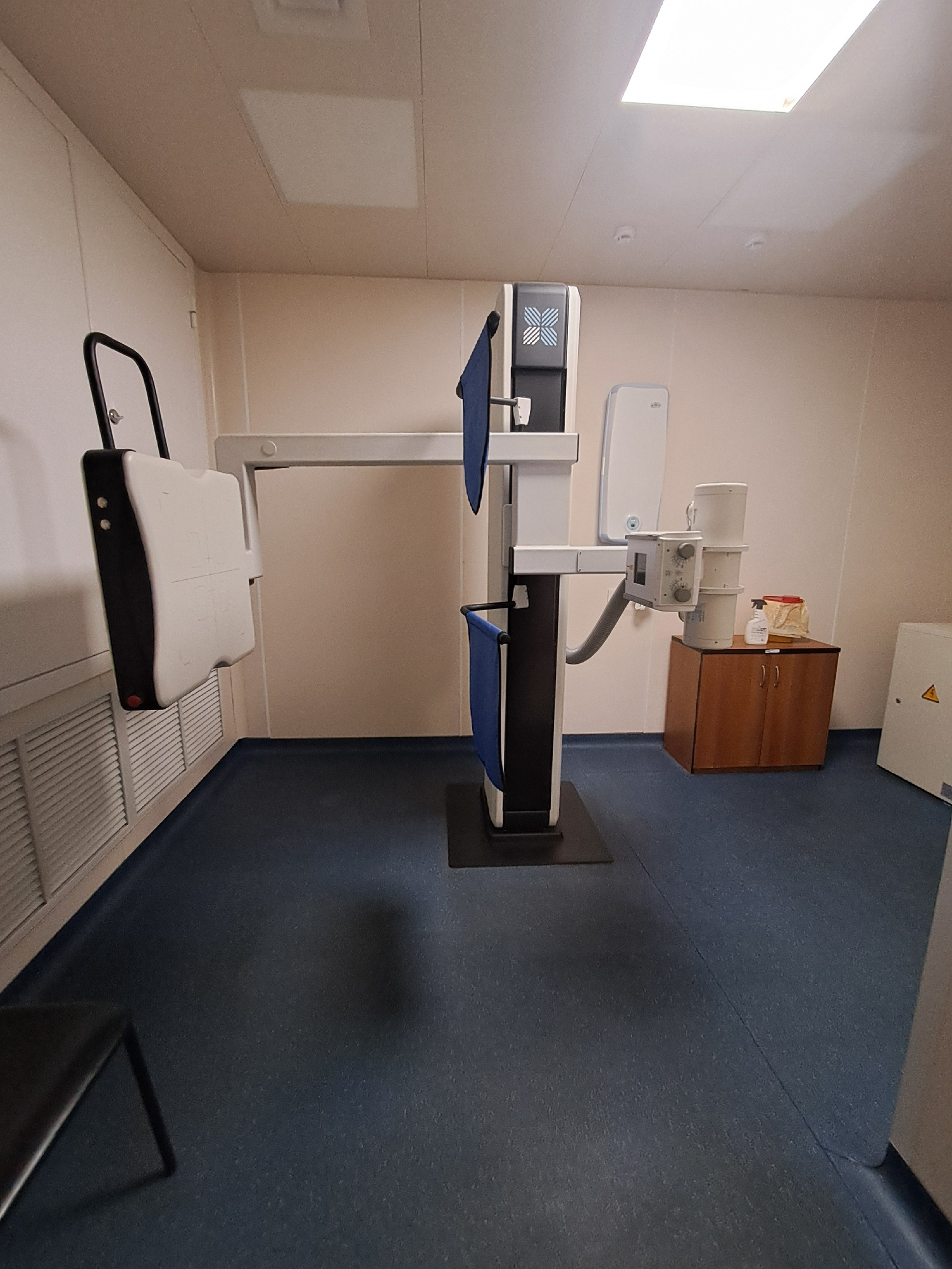 A room, possibly a hospital or clinic in Elektrostal, Russia, contains medical equipment. The equipment includes a large X-ray machine consisting of a diagnostic scanner with blue pads, a white overhead tube structure, and a portable patient stand. A brown cabinet is mounted to the wall above the machinery. The floor appears to be blue vinyl or rubber. A window provides natural light. | Open Wire