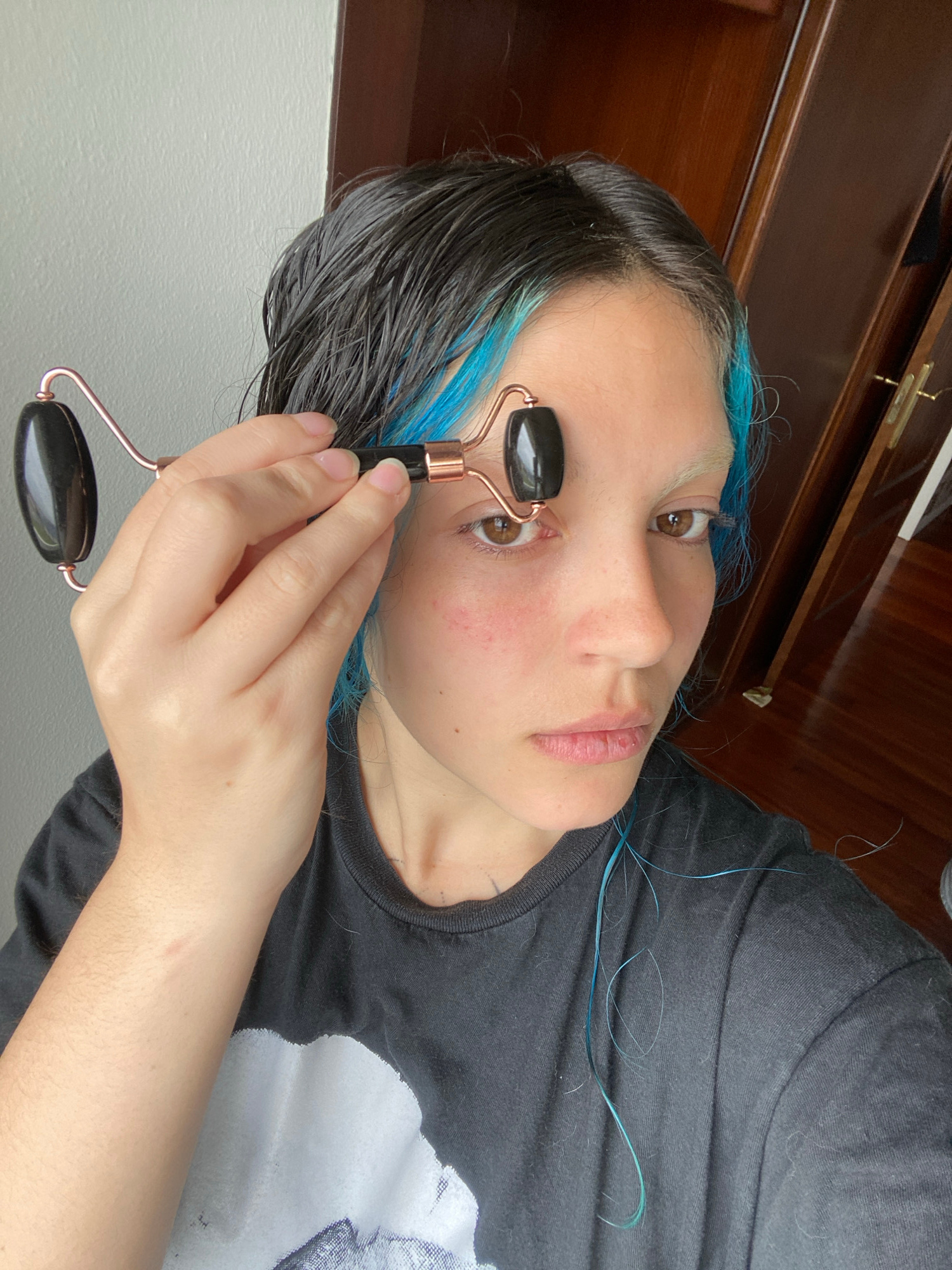 A woman is holding a facial roller to the right side of her face. The roller has a copper-colored frame and black stone rollers. The woman has black hair with blue highlights and is wearing a dark gra…read more