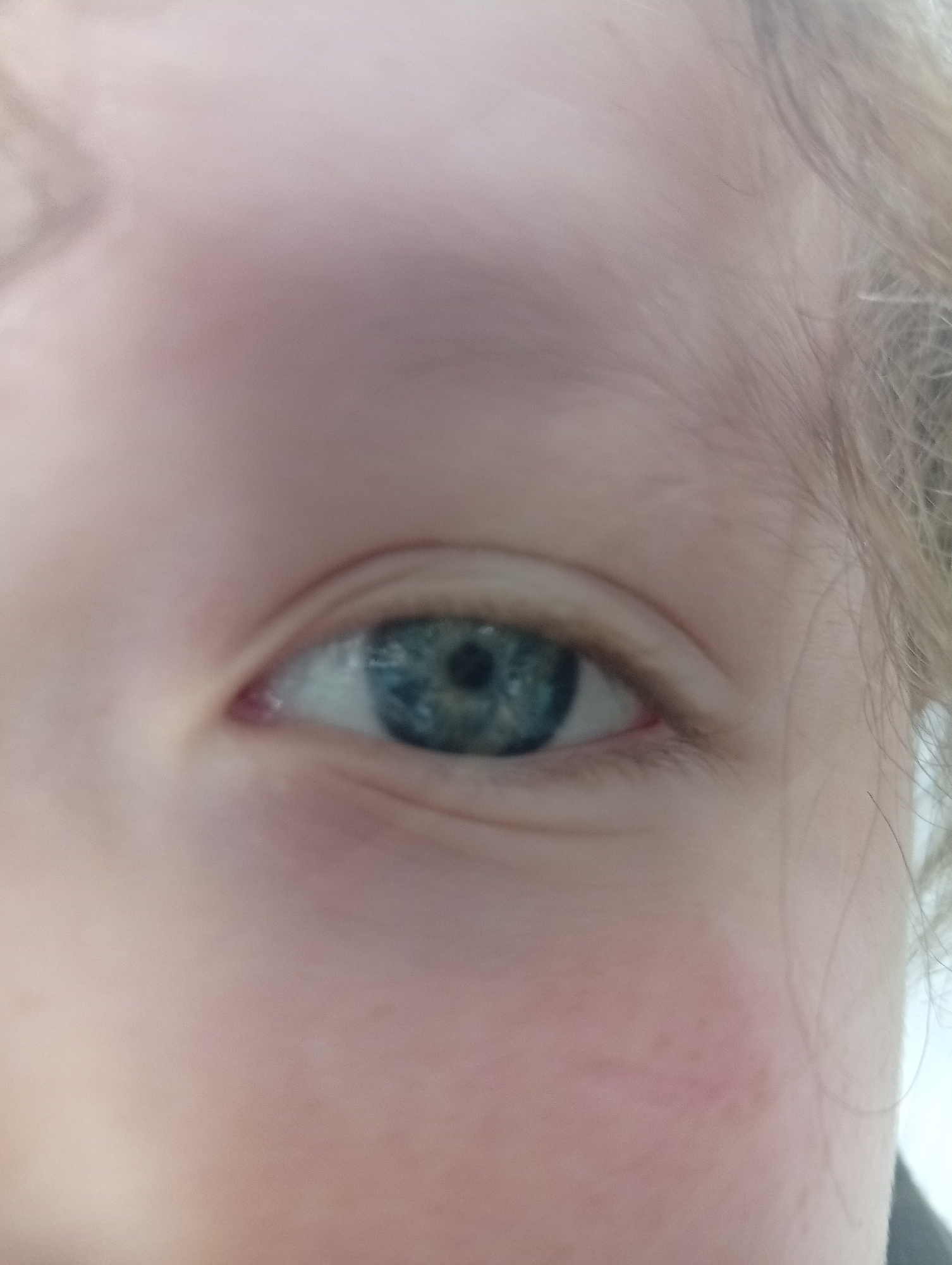 A close-up photograph captures the right eye and a portion of the face of an individual. The eye features a striking blue-green iris, displaying darker, intricate patterns that radiate from the centra…read more