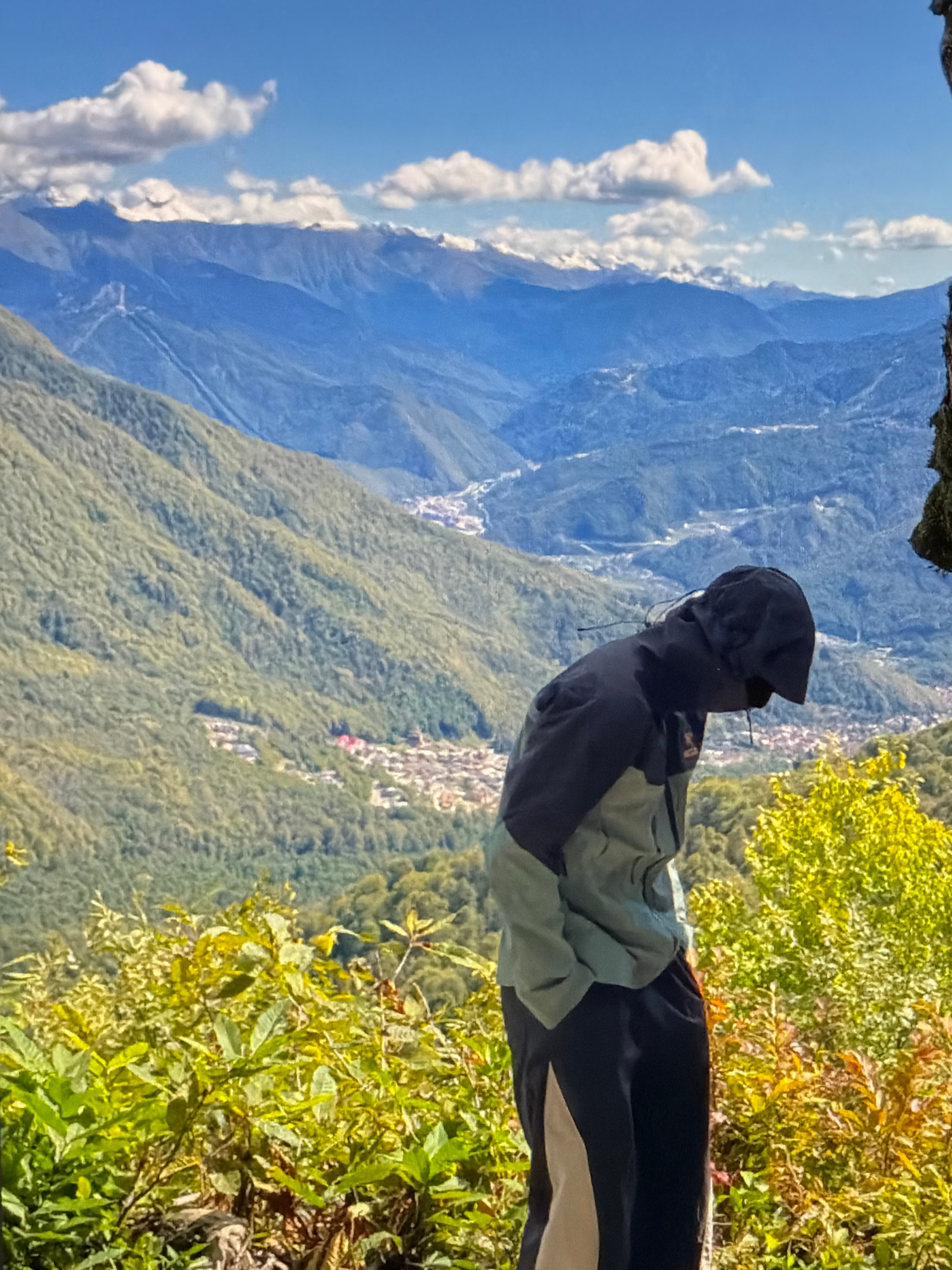 A person wearing a dark jacket with a hood stands on the edge of a cliff overlooking a mountainous landscape. The person is looking towards the mountains. The landscape includes a town nestled in theβ¦read more