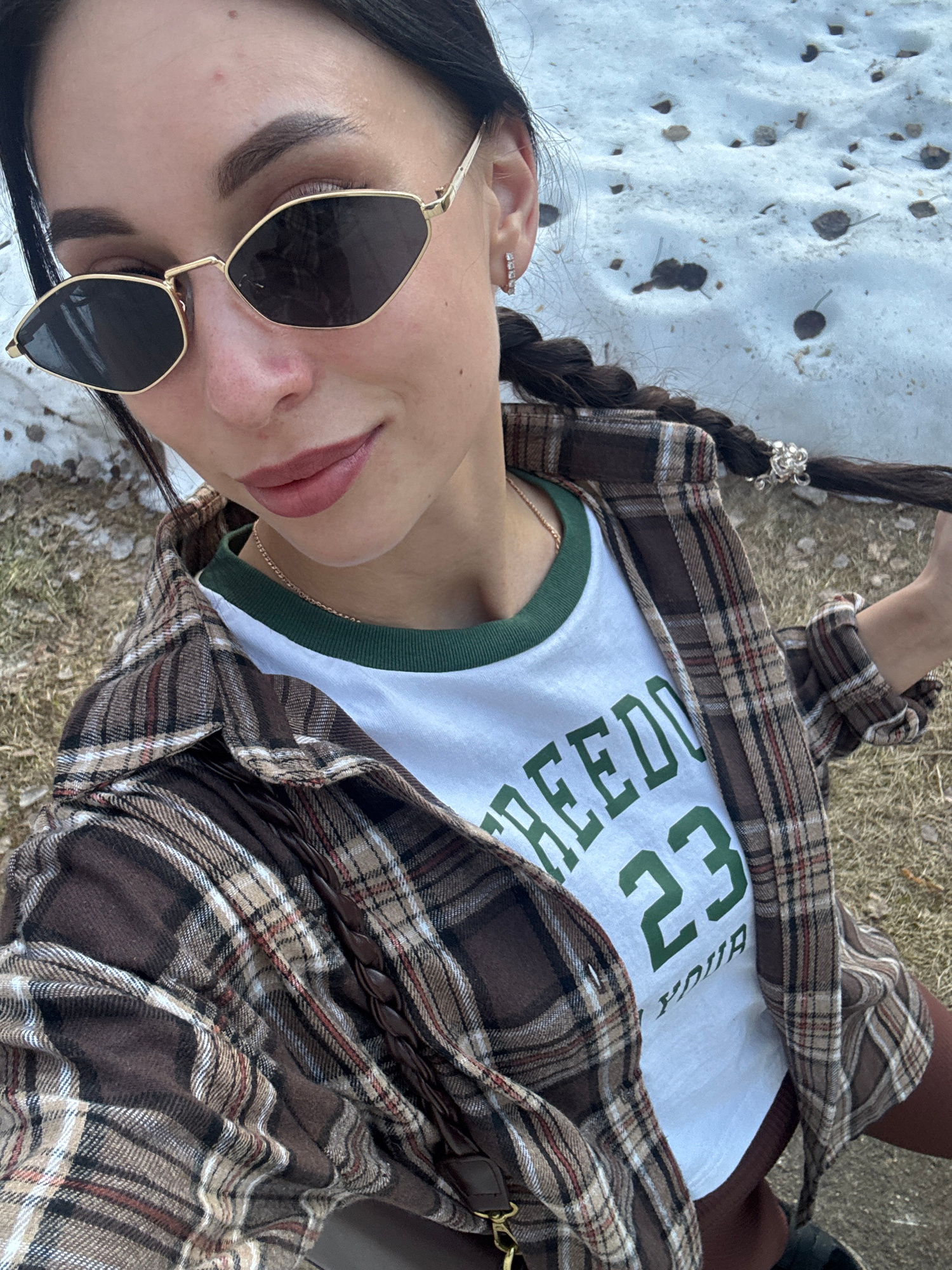 A young woman is pictured in a close-up, selfie-style shot. She has long, dark hair styled in a braid with a decorative silver clip, and she is wearing sunglasses with a geometric frame. She is dresse…read more