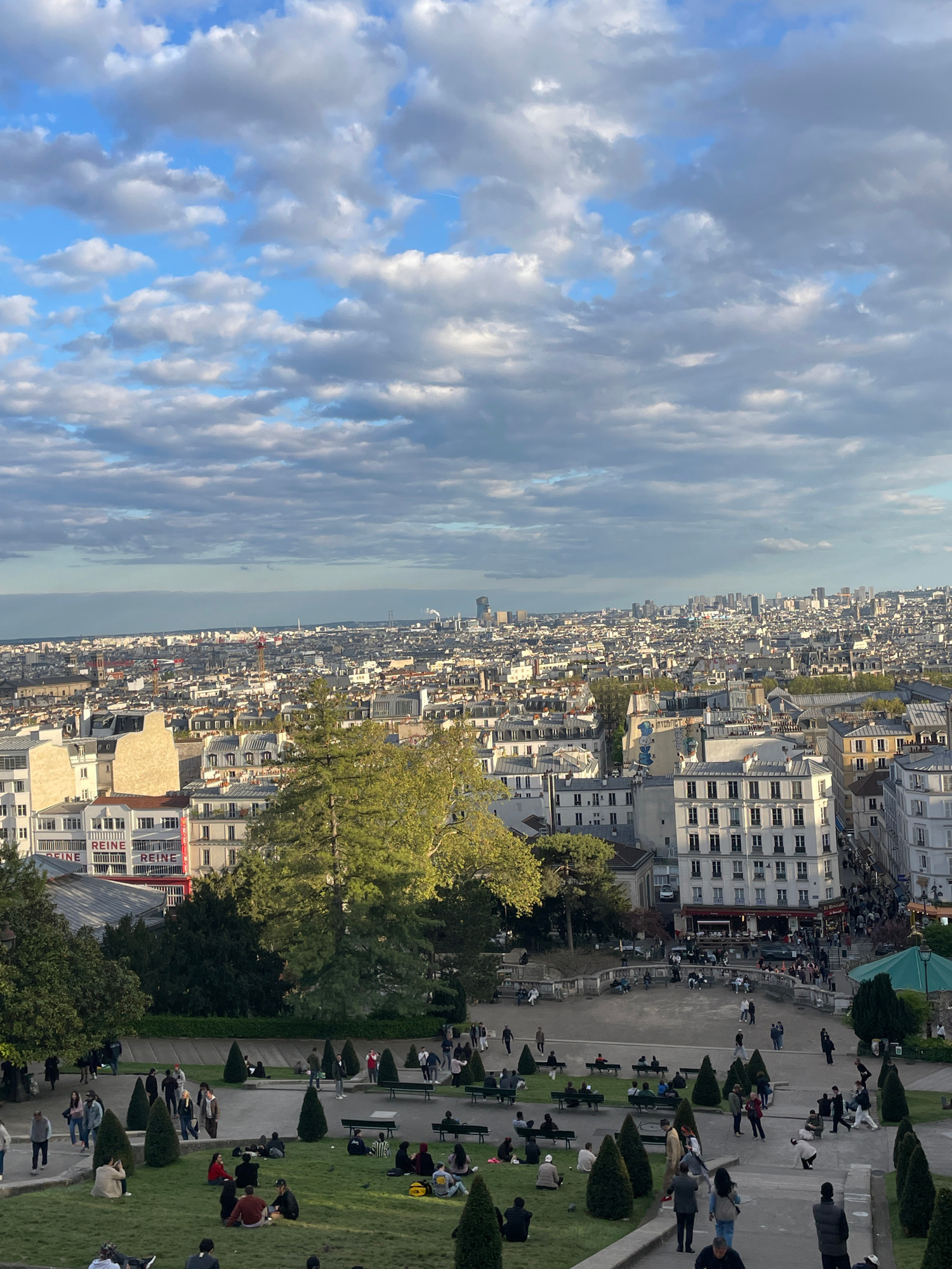 A high-angle shot of Paris, France, on a partially cloudy day. The cityscape is dominated by buildings with light-colored facades, densely packed together. In the distance, a body of water is visible.…read more