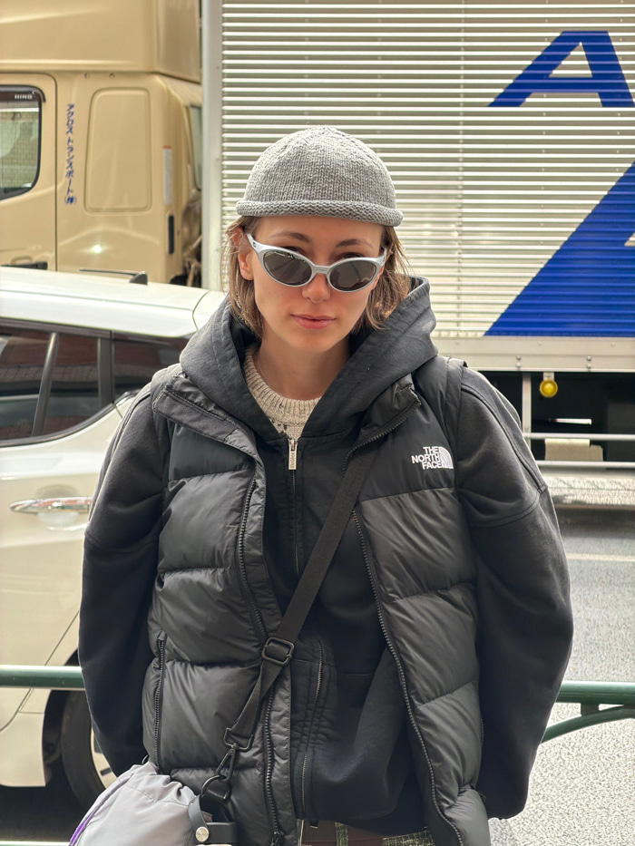 A person wearing a gray knit beanie and silver framed sunglasses stands in front of a building. They are wearing a black puffer jacket with a hood, a sweater with an intricate design, and a black stra…read more