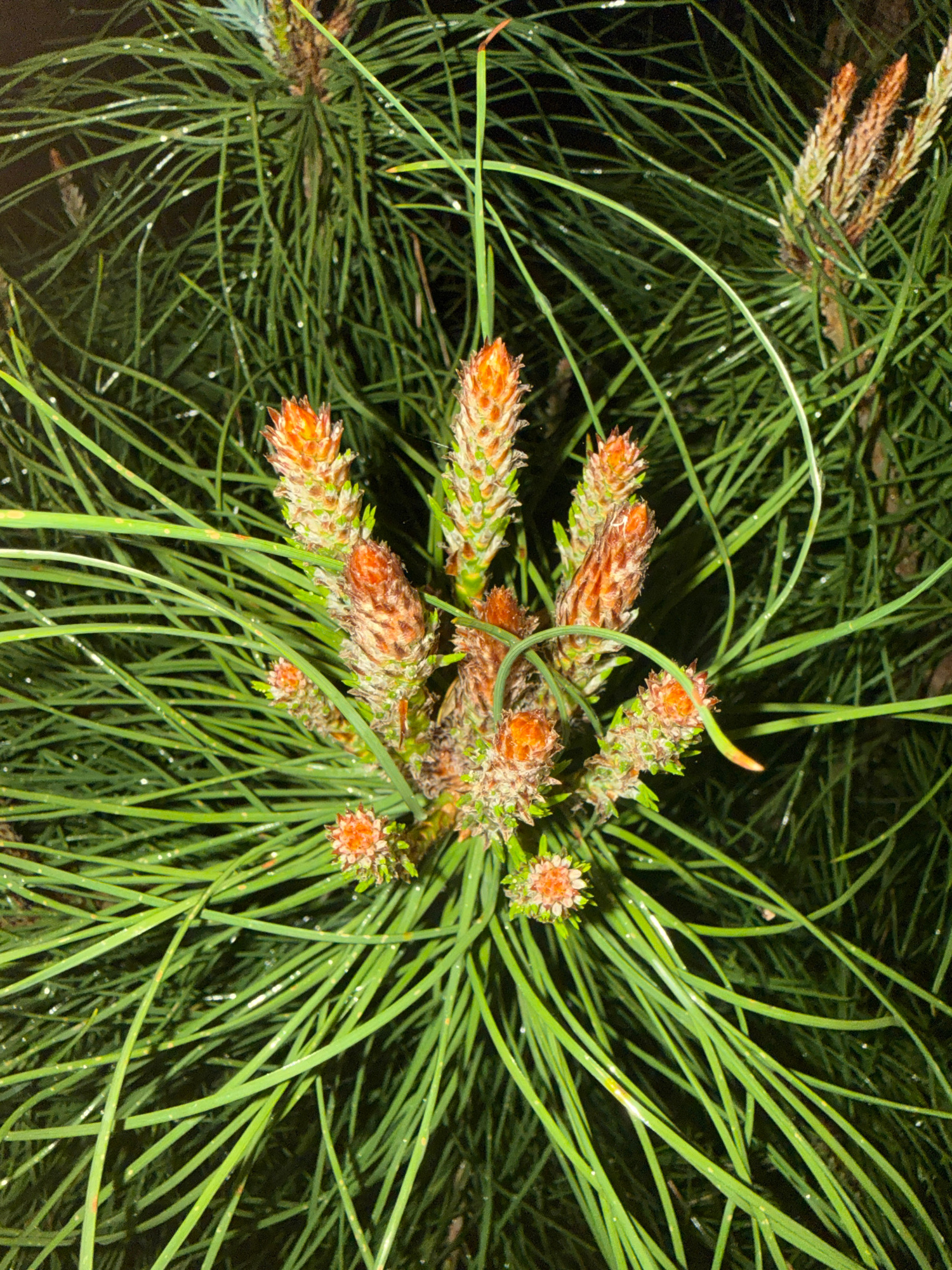 The image shows a close-up of pine needles and young pine cones. The needles are long, thin, and green, with a few scattered droplets on their surfaces, suggesting moisture. The pine cones are small,…read more