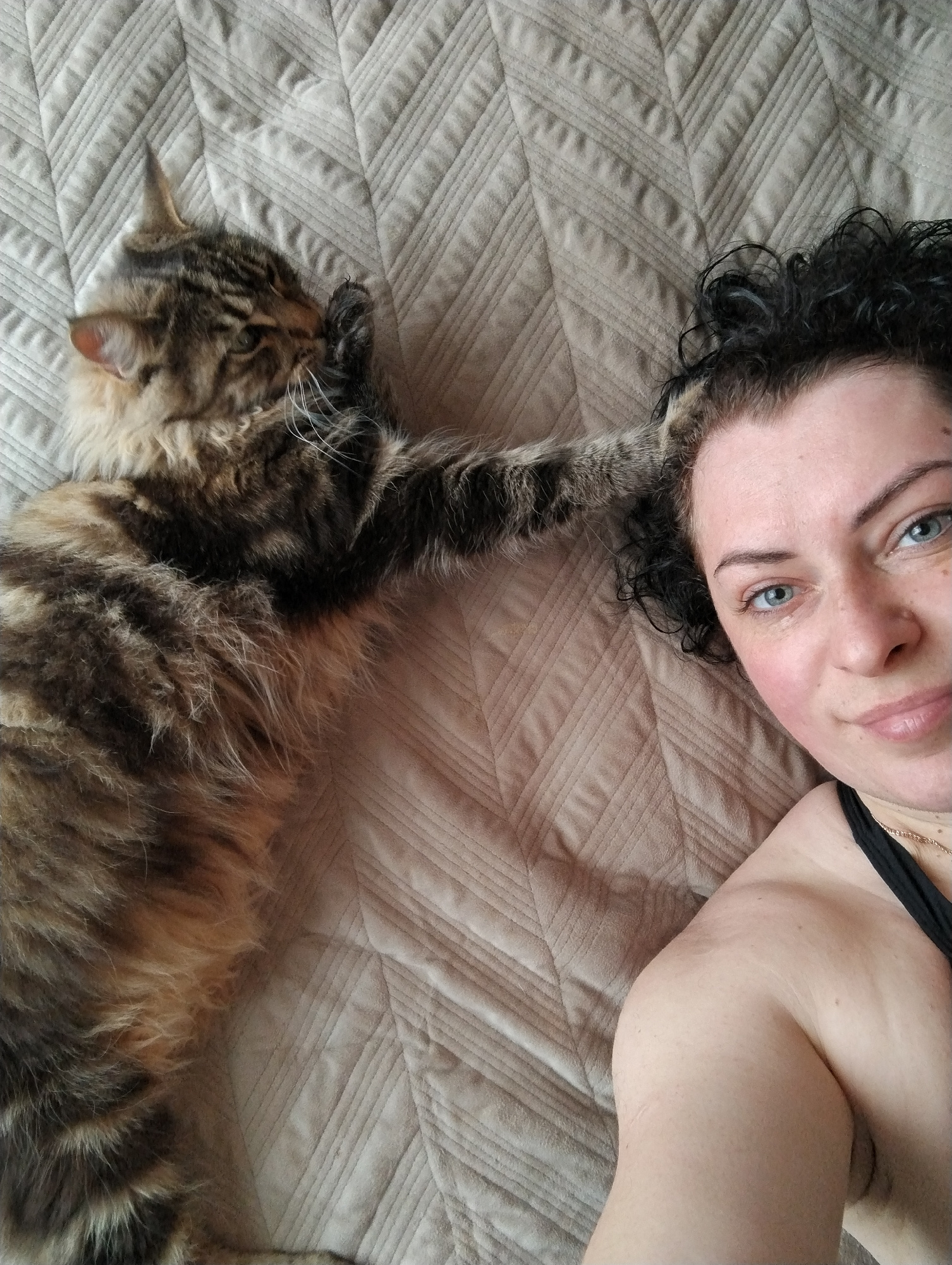 A woman with curly black hair and light blue eyes lies on a quilted beige bedspread next to a tabby cat with long fur. The cat's paw is raised near the woman's face. The woman is wearing a black top,…read more