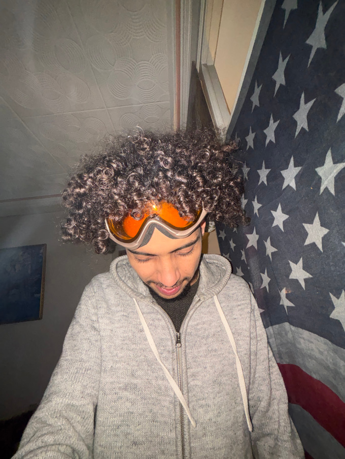 An individual is depicted in an indoor setting in the city of Tanger, Morocco. The subject is a male with dark, curly hair, presented from the upper chest upwards. He wears orange-tinted ski goggles p…read more