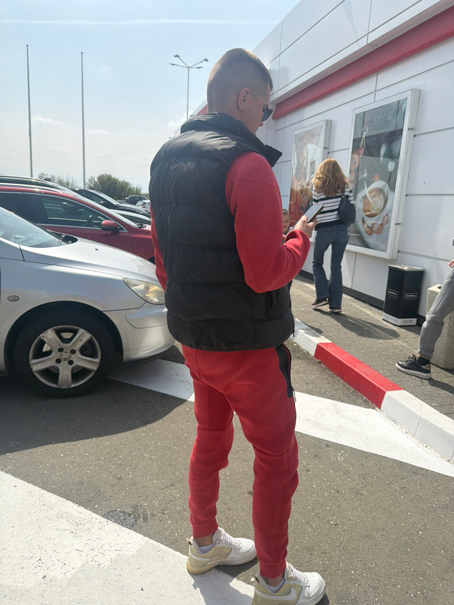 A medium shot depicts a man standing near a crosswalk and parked cars in Shtarkovo, Bulgaria. He is wearing sunglasses, a red tracksuit, and a black vest. The man is looking at his phone. In the backg…read more