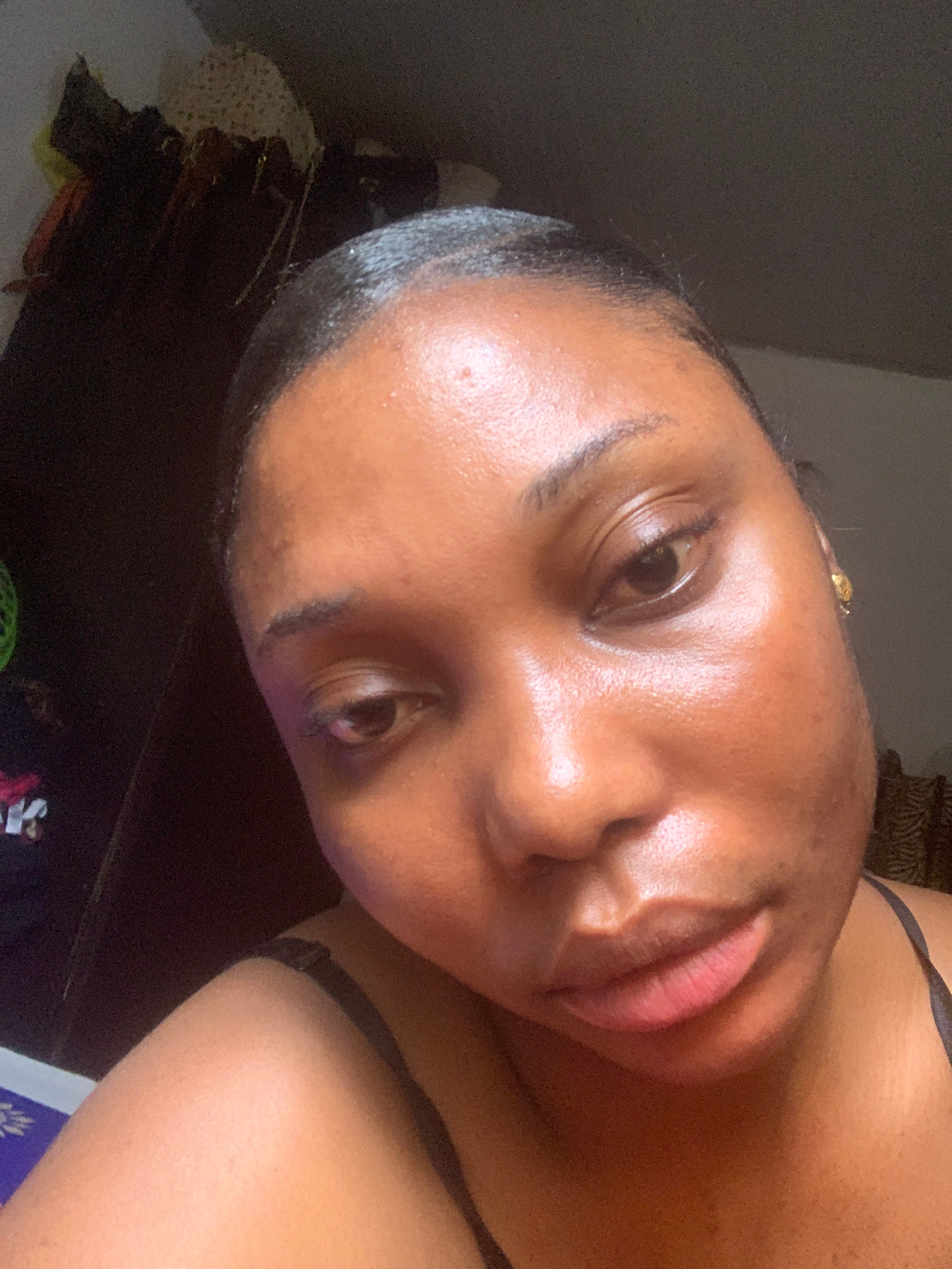 A close-up photo shows a dark-skinned woman with shiny skin. She has dark eyes and full, pink lips. She is wearing a thin-strapped top. The background shows a dark wooden surface and a bit of a gray w…read more