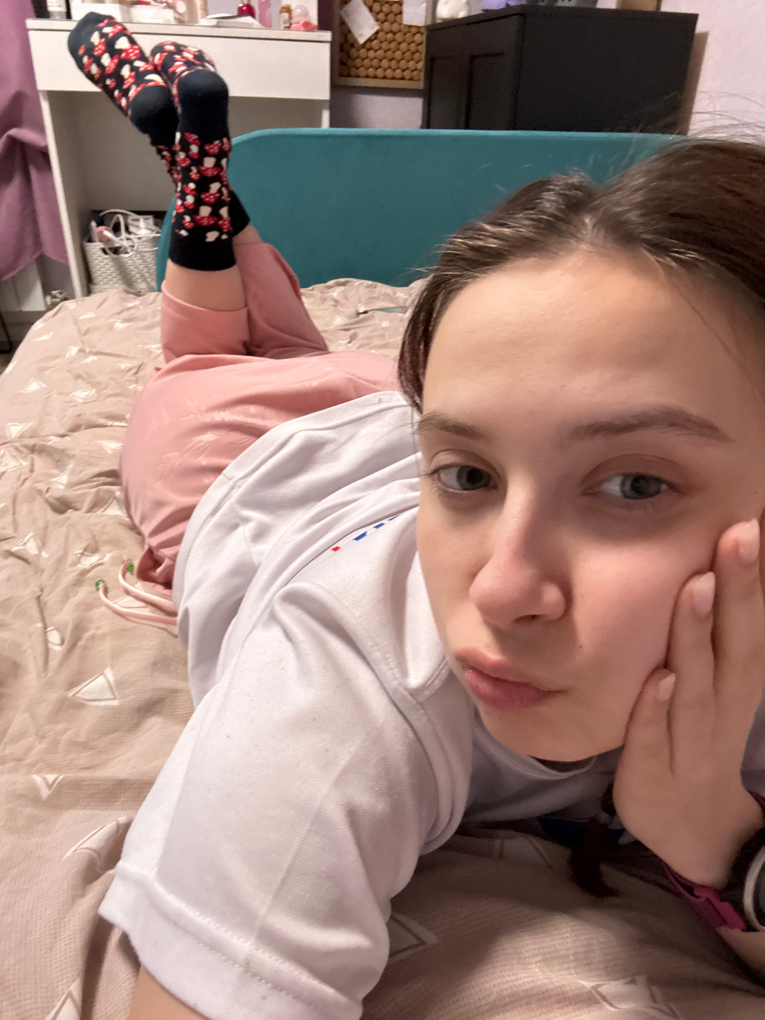A young person is lying on a bed with a light beige patterned comforter. They are wearing a white t-shirt, pink pants, and black socks with red and white mushroom patterns. The person is holding their…read more
