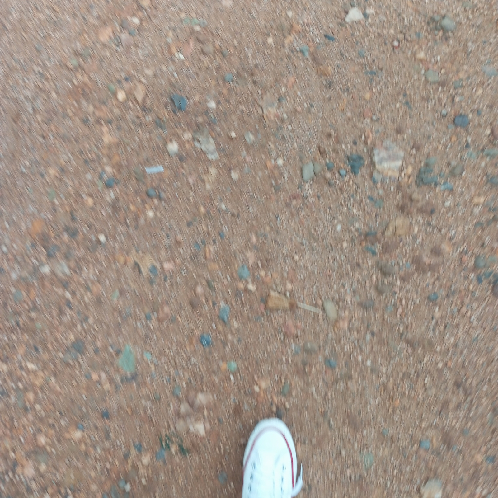 The image depicts a ground surface composed of reddish-brown dirt and small pebbles. A portion of a white tennis shoe with a red stripe is visible in the lower right corner of the frame. The image app…read more
