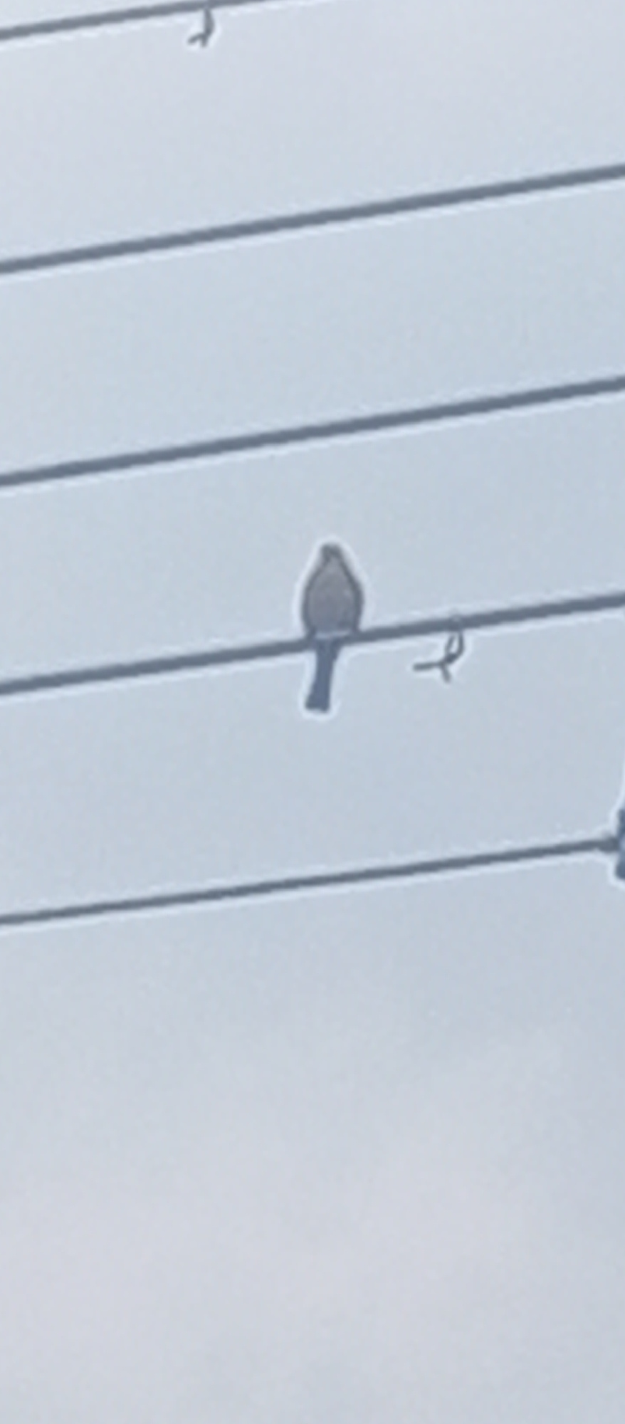 The image shows a bird perched on a power line. The bird has a grey body and a long tail. The power lines are running horizontally across the image. The background is an overcast sky. The location isβ¦read more