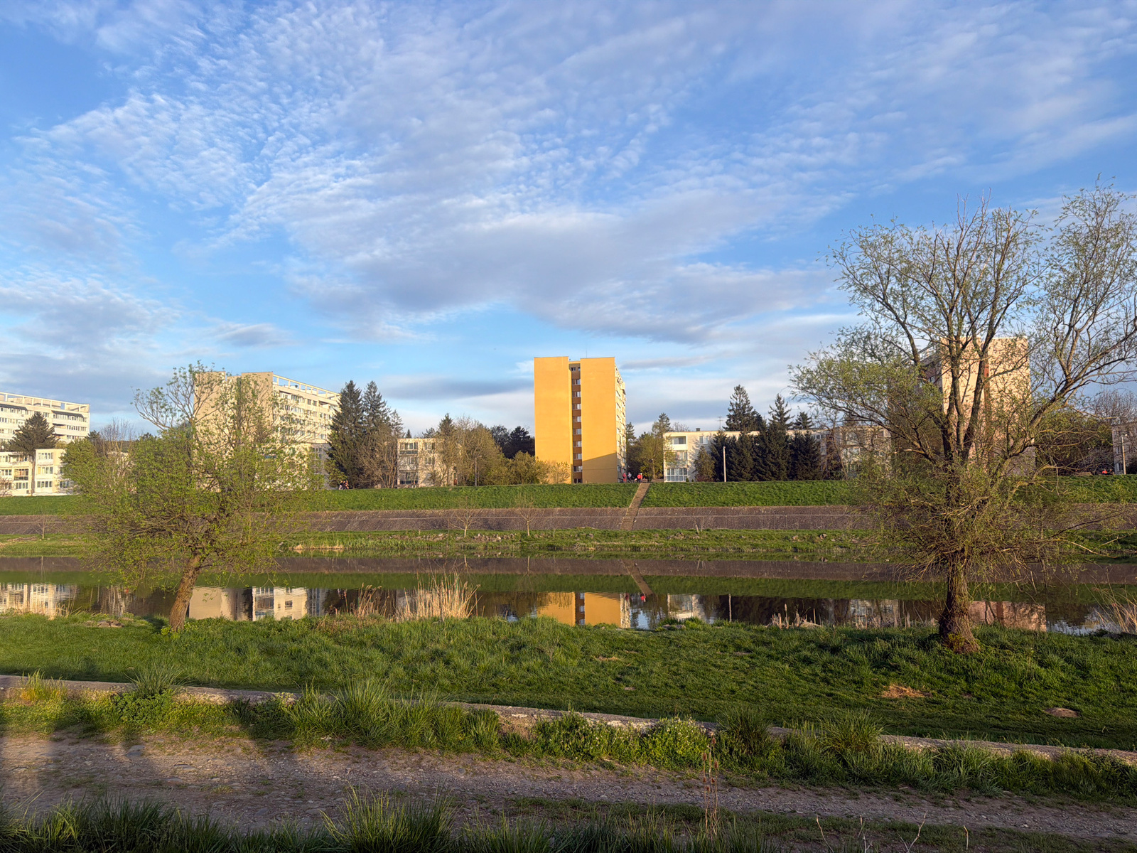 The image shows a cityscape in Târgu Mureș, Romania. A river runs across the middle ground, its surface reflecting the buildings and sky. On the far bank, a grassy embankment is topped by residential buildings, including a prominent, tall yellow apartment building. Trees are interspersed among the buildings. Two leafless trees, one on the left and one on the right, frame the foreground. A dirt path borders the near bank of the river, with green grass on the river's edge. The sky is blue with scattered clouds. There are figures of people visible on the embankment behind the river. | Open Wire