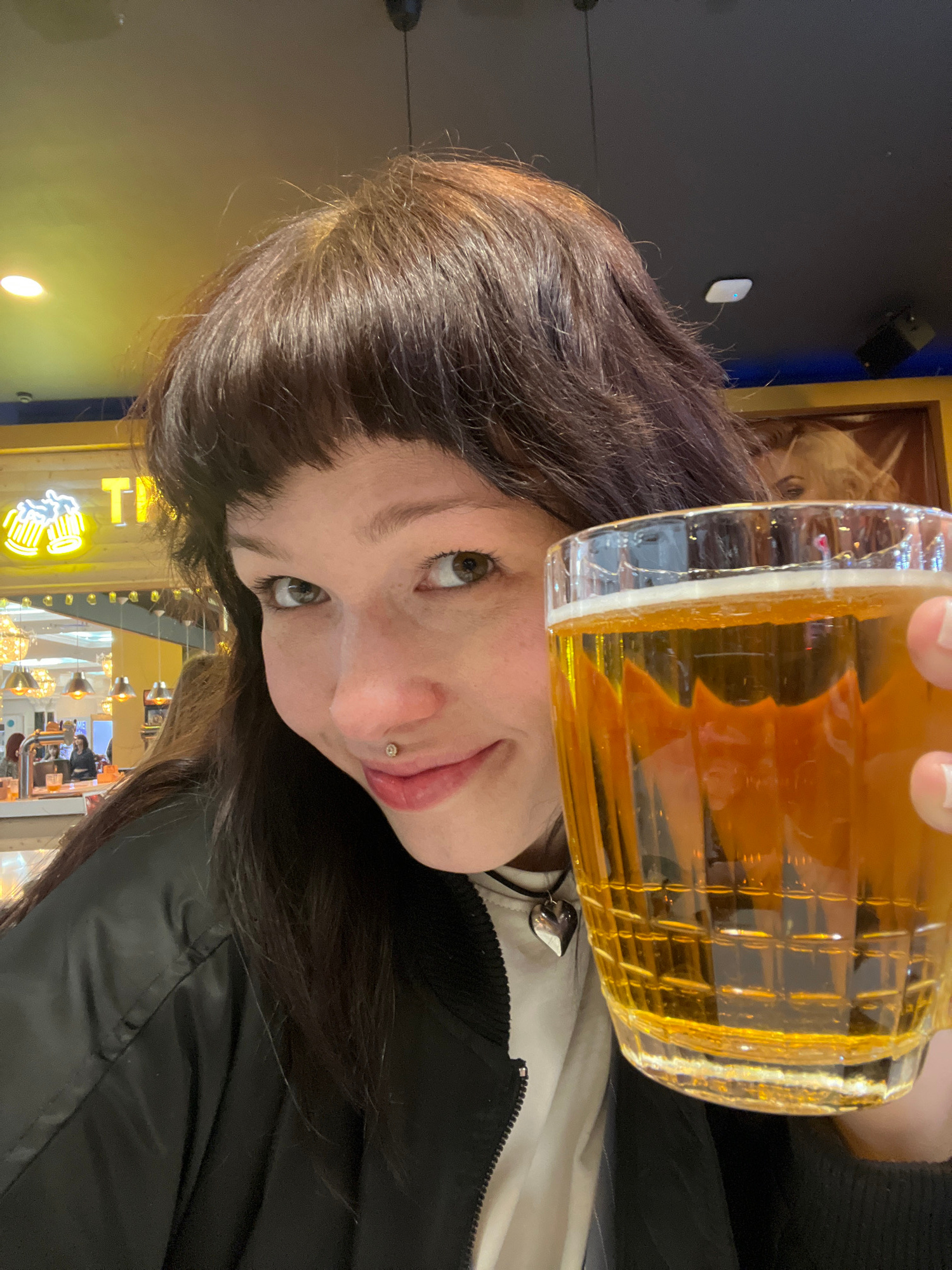 A woman with brown hair and a lip piercing is holding a beer in a glass. She is wearing a black jacket over a white shirt. The background shows a restaurant interior, identifiable as Kazan, Russia by…read more
