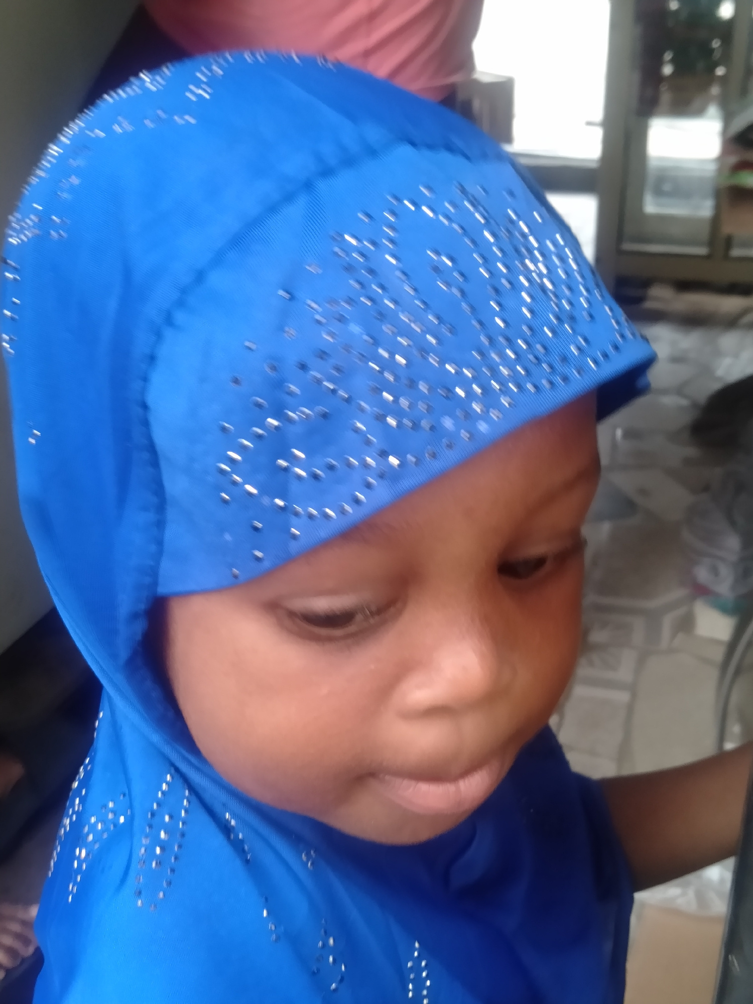 A close-up, slightly high-angle portrait features a young child, likely a toddler, with dark skin, wearing a vibrant blue head covering. The head covering, possibly a hijab, is richly embellished with…read more
