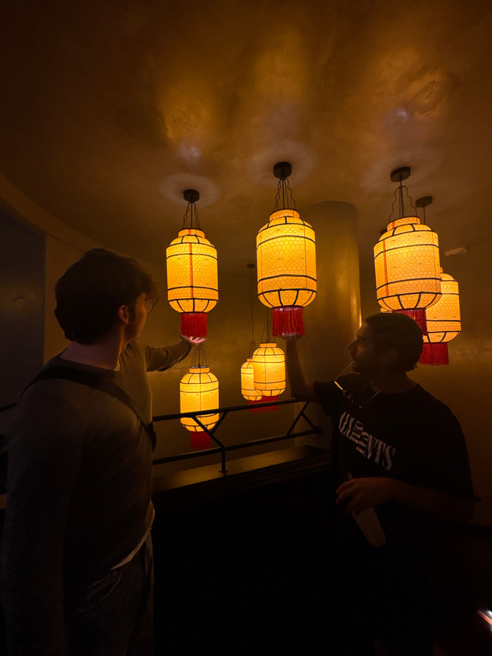 Two people stand under a series of yellow and red paper lanterns hanging from the ceiling. The lights illuminate the wall with warm tones, casting shadows from the lantern's supports. One person, wear…read more