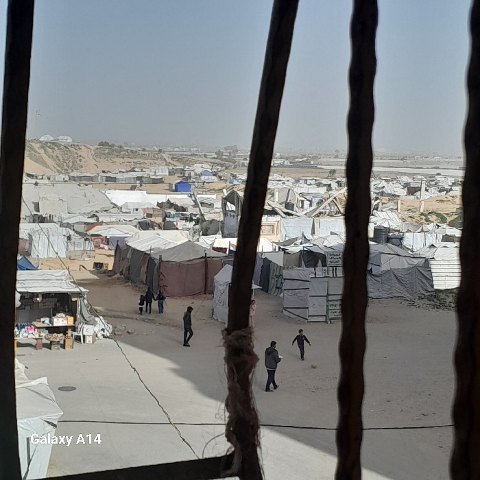A large refugee camp is viewed from a window with a lattice. The camp consists of many small, makeshift tents and dwellings spread across a flat, arid landscape. Several individuals are walking along…read more