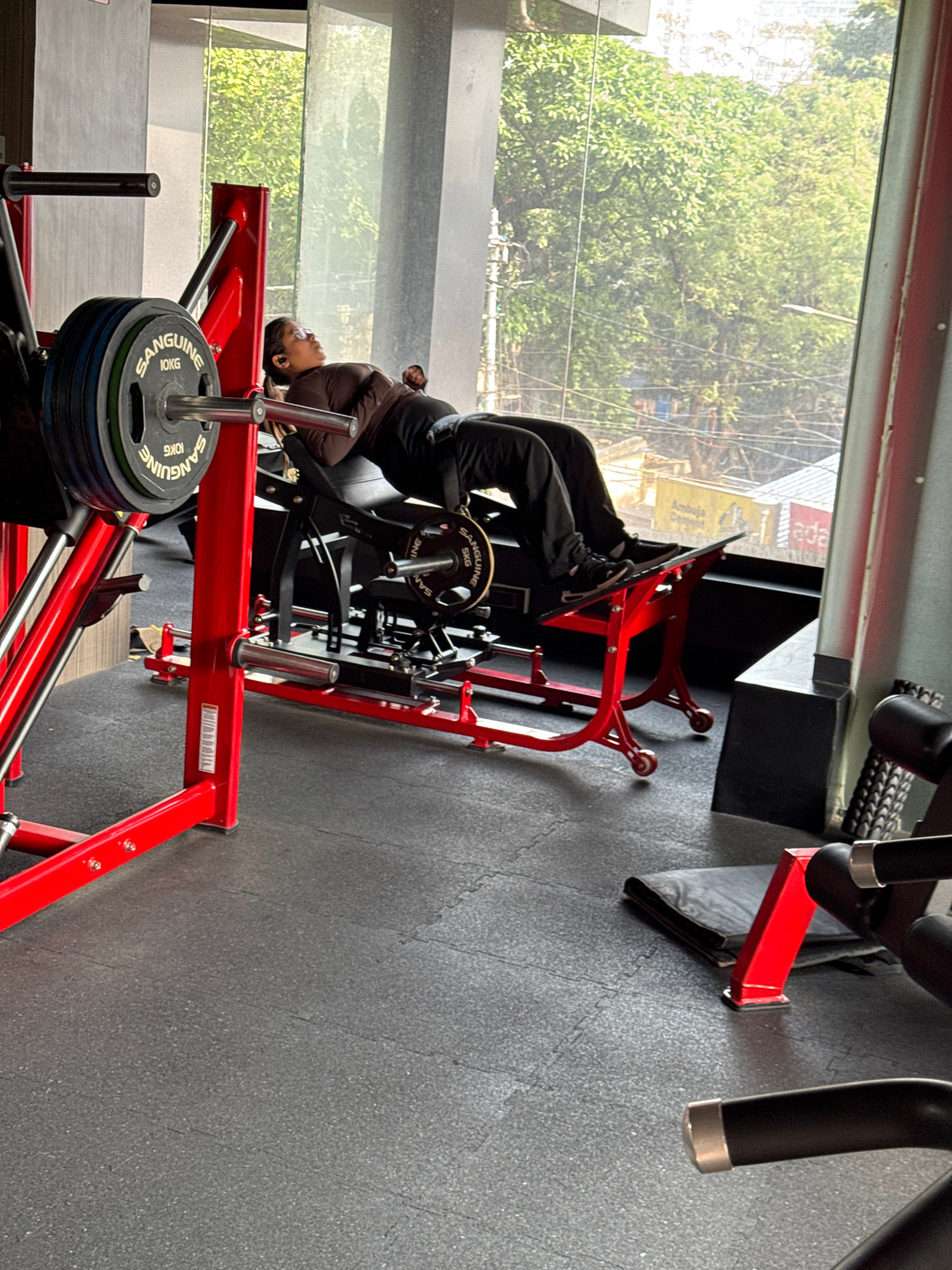 A woman is using a red leg press machine at a gym in Kolkata, India. The woman is wearing a brown jacket and black pants and is lying at a 45-degree angle. Weights are stacked on the foot platform. A…read more