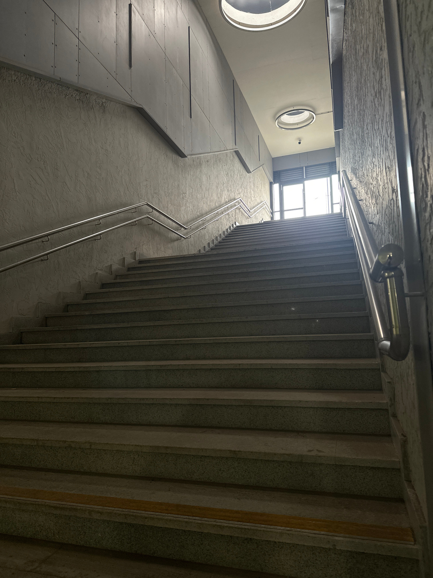This interior shot depicts a modern architectural space with contrasting elements. On the left, a smooth, flat, metal-clad wall features circular windows. Parallel to this, on the right, a textured, v…read more