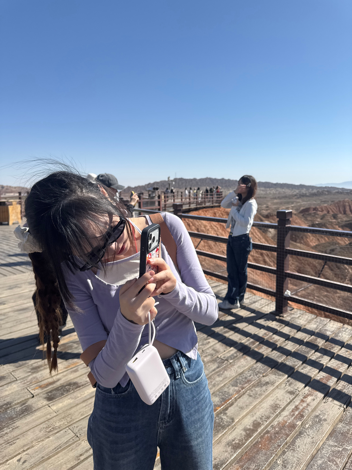 The image depicts an outdoor scenic viewpoint, likely located in Zhangye, China, given the distinctive reddish-brown geological formations characteristic of Danxia landforms. The scene is bathed in br…read more