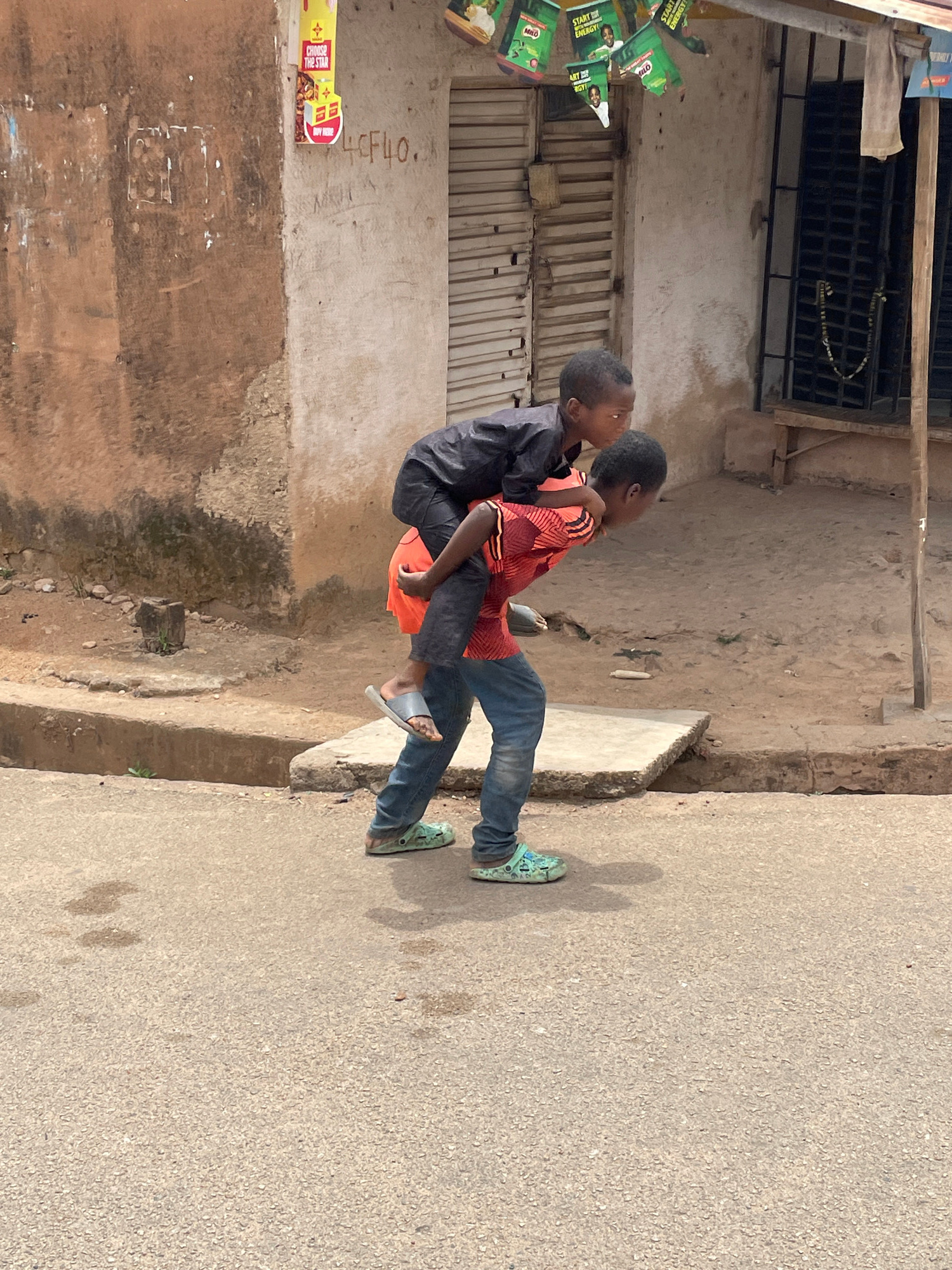 Two young boys are standing near a weathered building and a road in Jos, Nigeria. One boy is carrying the other on his back. The boy carrying has on a dark shirt and jeans. The boy being carried has o…read more