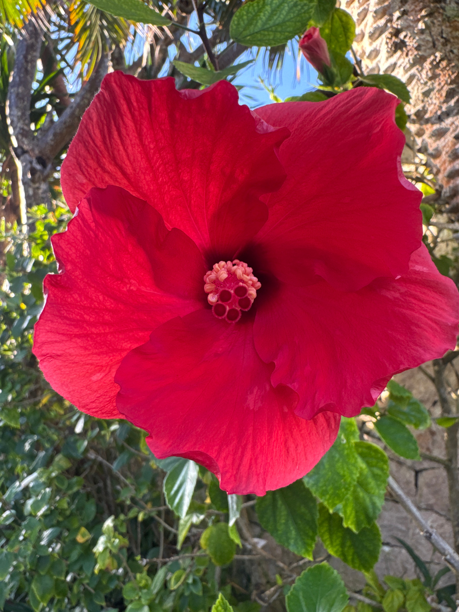 Close-up, upward-angle shot of a vibrant, red hibiscus flower in bloom. The flower is the central subject, featuring a detailed center with visible pollen structures. The background consists of green…read more