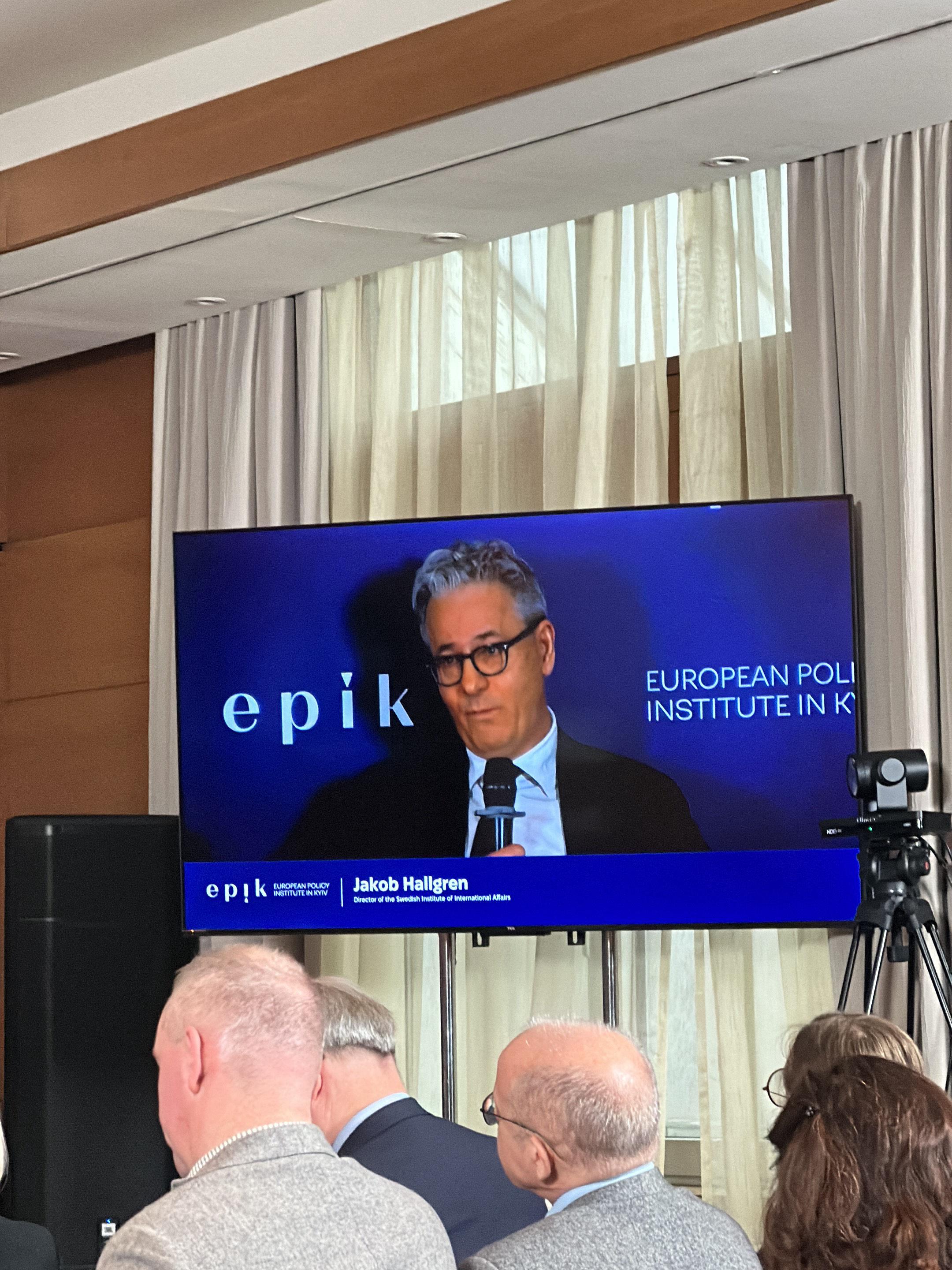The image shows a scene from an event at the European Policy Institute in Kyiv, Ukraine. A video screen displays Jakob Hallgren, Director of the Swedish Institute of International Affairs, speaking or…read more