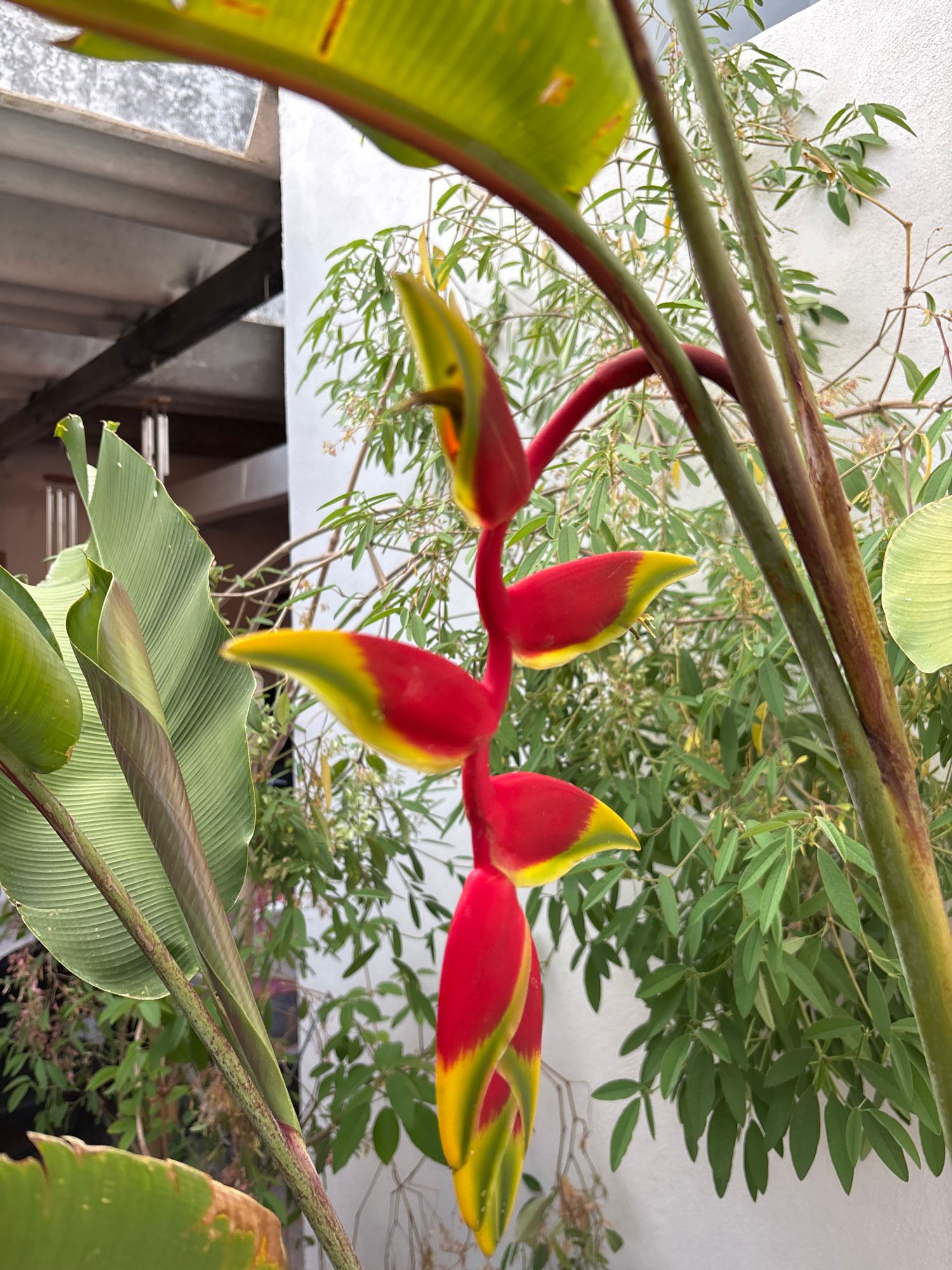 The image presents a close-up view of a Heliconia flower, commonly known as lobster-claws or false bird-of-paradise, in vibrant red and yellow hues. The flower is surrounded by lush green foliage, pos…read more