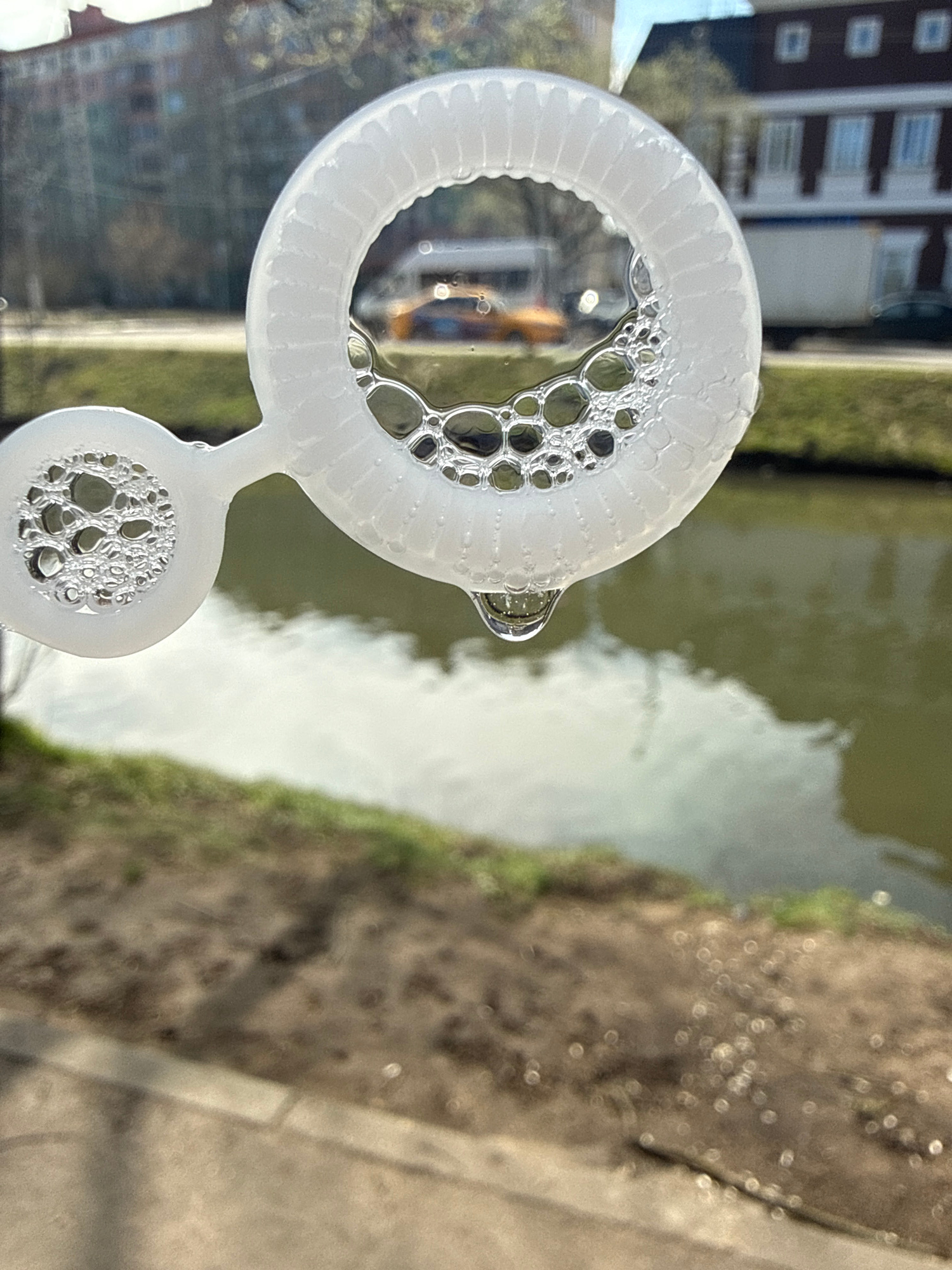 A plastic bubble wand with soapy water films forming bubbles is in the foreground. Behind the wand, a canal is visible, reflecting the sky and possibly a building. On the right side of the frame, ther…read more