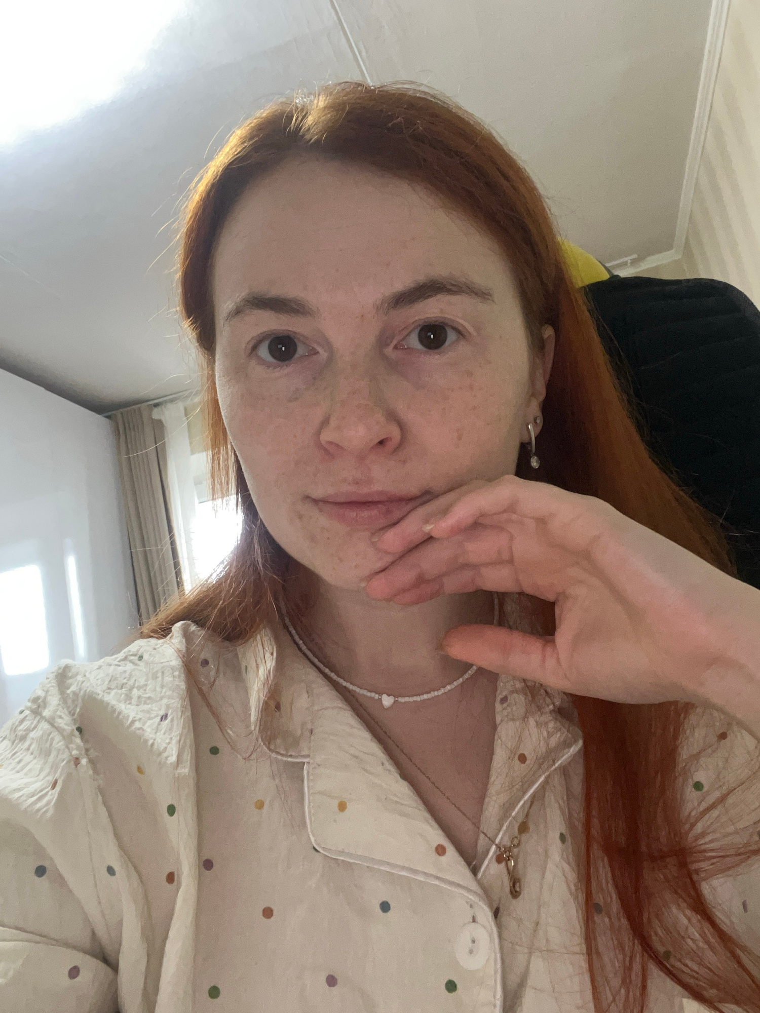 A woman with auburn hair is facing the camera. Her hair partially covers the right side of her face and upper chest. She has a fair complexion with freckles. Her right hand is held against her cheek.…read more