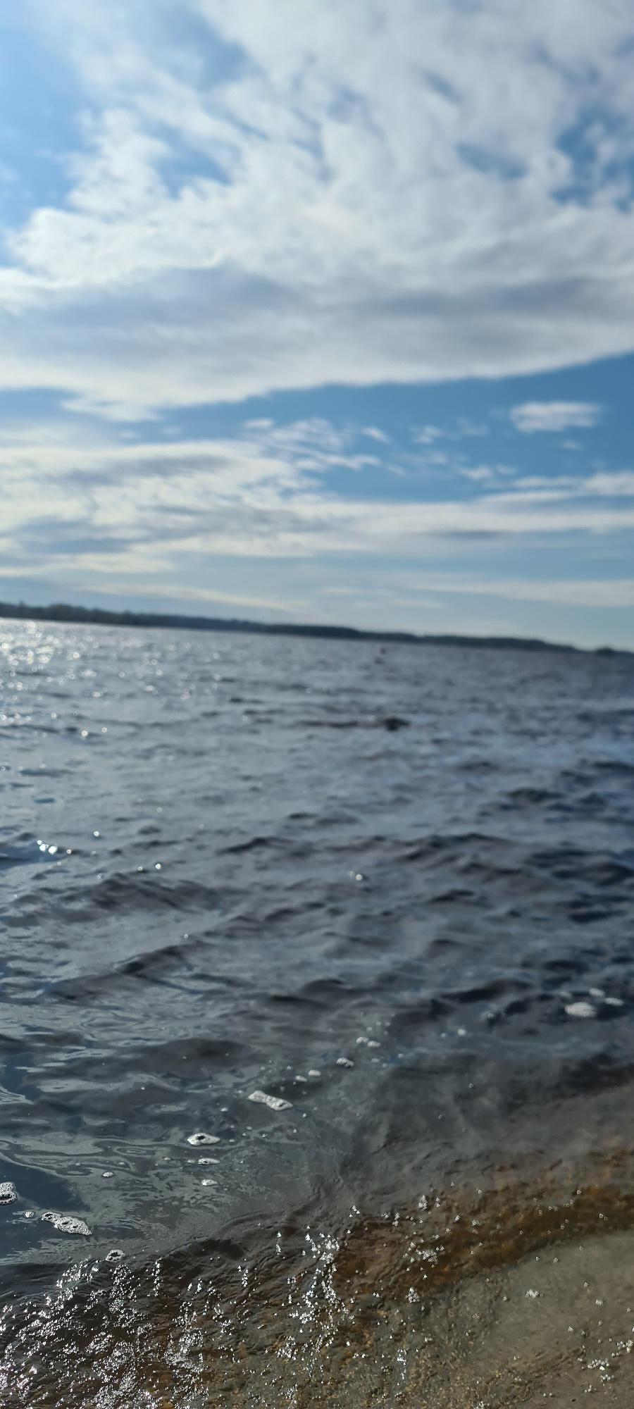 The image captures a natural landscape scene in Ikšķile, Latvia, under a clear daytime sky. The composition is divided into three main horizontal sections when viewed correctly. The top third of the…read more