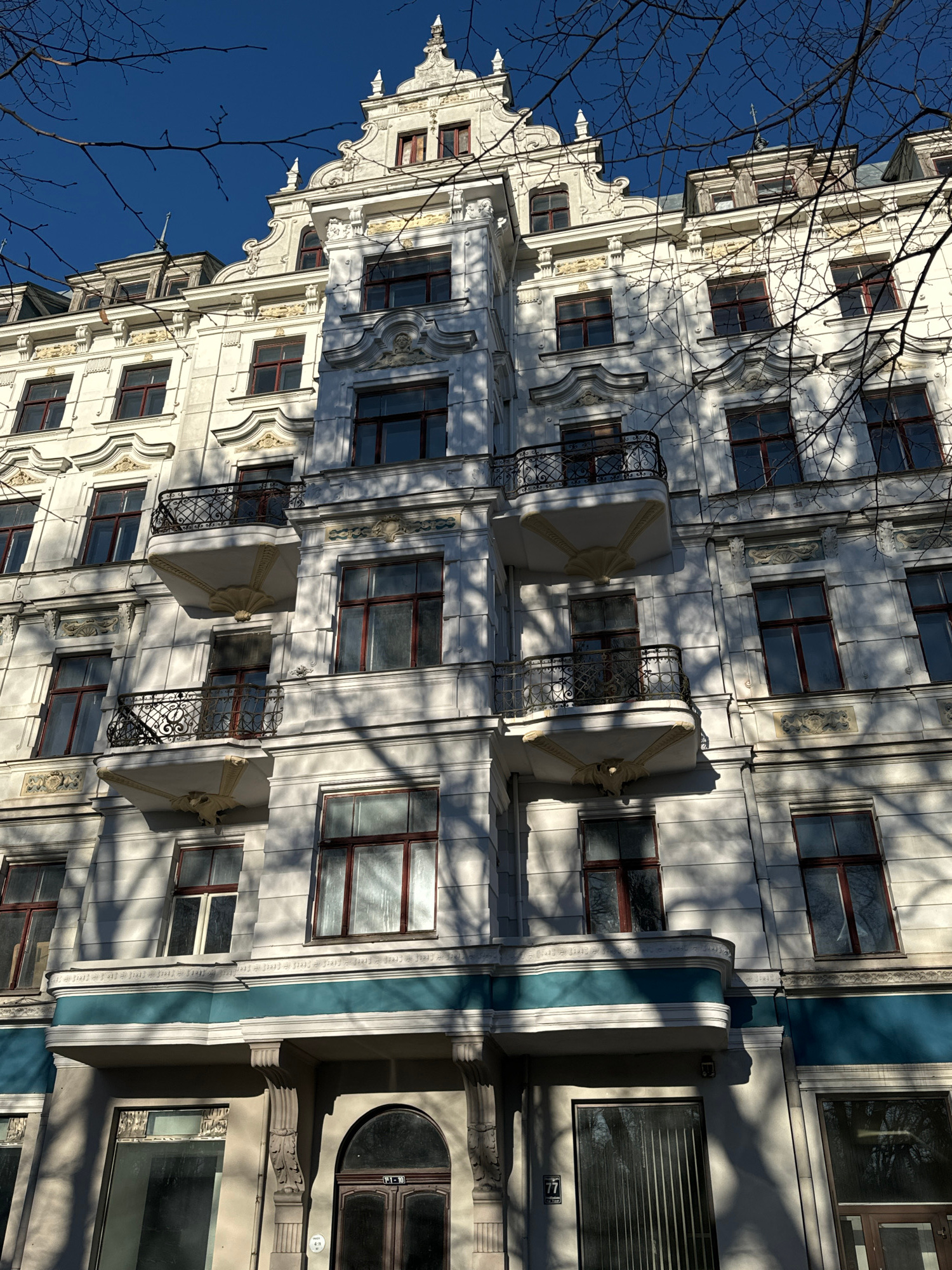 The image shows an upward-facing view of an ornate, white building in Riga, Latvia, likely a historical Art Nouveau structure. The architecture includes numerous windows with dark frames, decorative m…read more