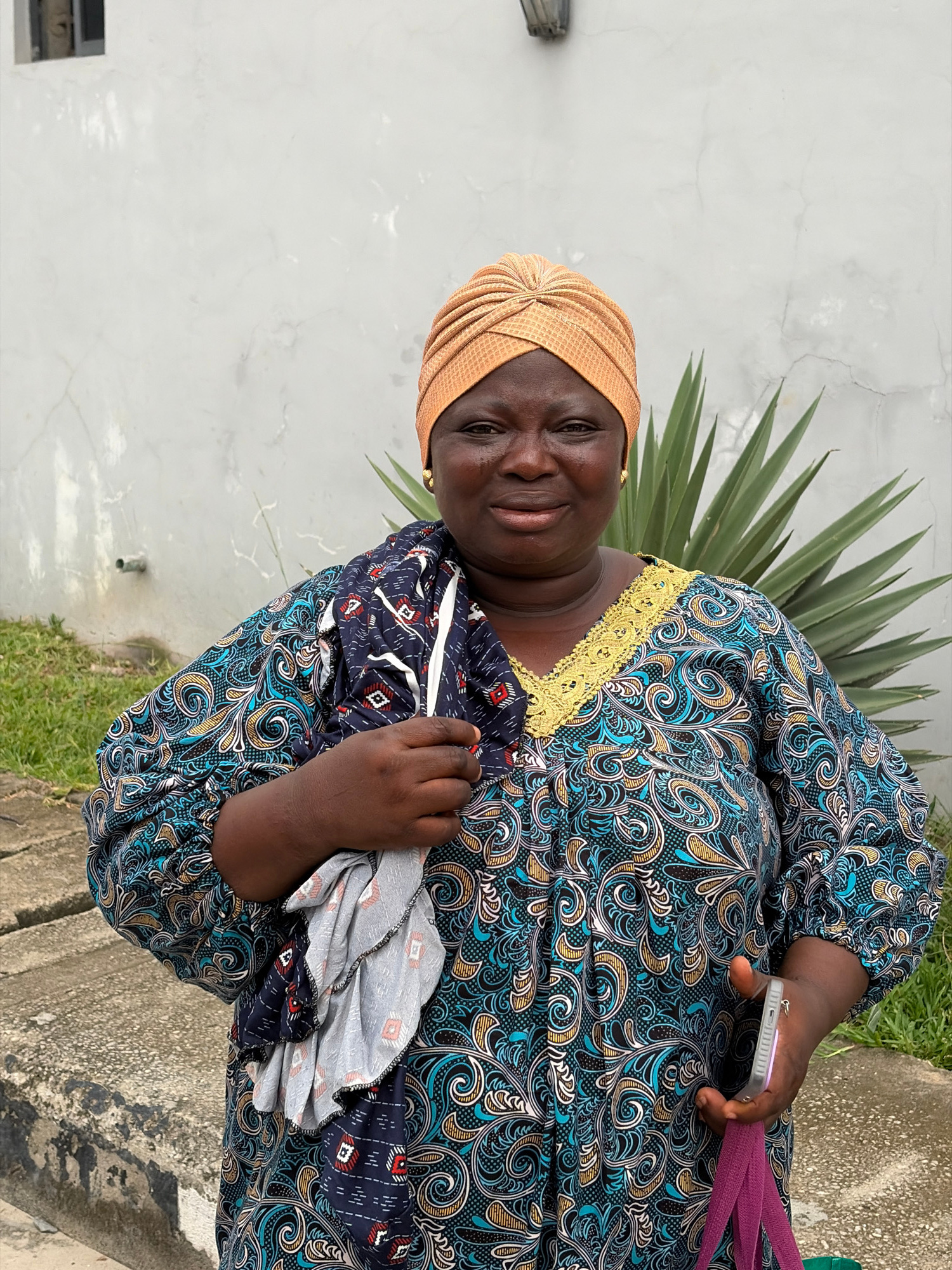 A woman smiles gently towards the camera in an outdoor setting in Igboefon, Nigeria. She is positioned against a light grey, somewhat cracked wall, with a tall, spiky-leaved tropical plant visible beh…read more