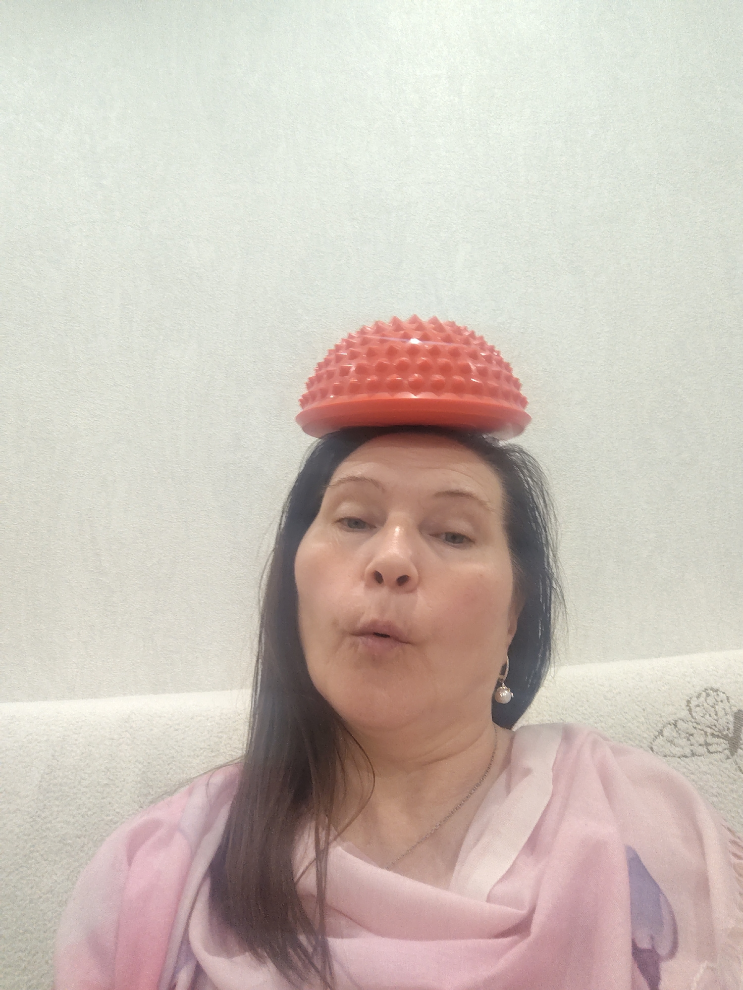 A woman with dark hair poses indoors, holding a red, spiked dome-shaped object on her head. She has an expression of puckered lips. She is wearing a pink scarf, a silver necklace, and drop earrings. The background features a textured white wall and a light-colored sofa. The location is presumed to be Sarapul, Russia. | Open Wire