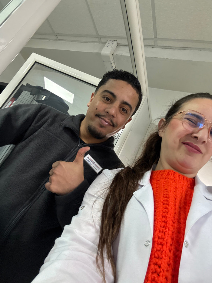 The image displays two individuals, one male and one female, posing in an indoor commercial or professional setting within Meknes, Morocco. The male, positioned to the left, has dark hair, a mustache,…read more