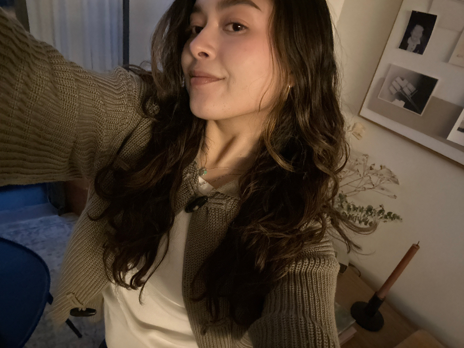 A rotated indoor shot depicts a woman with long, dark brown, wavy hair. She is wearing a light-colored knit sweater over a white shirt. The woman's face is visible, and she appears to be looking at thβ¦read more