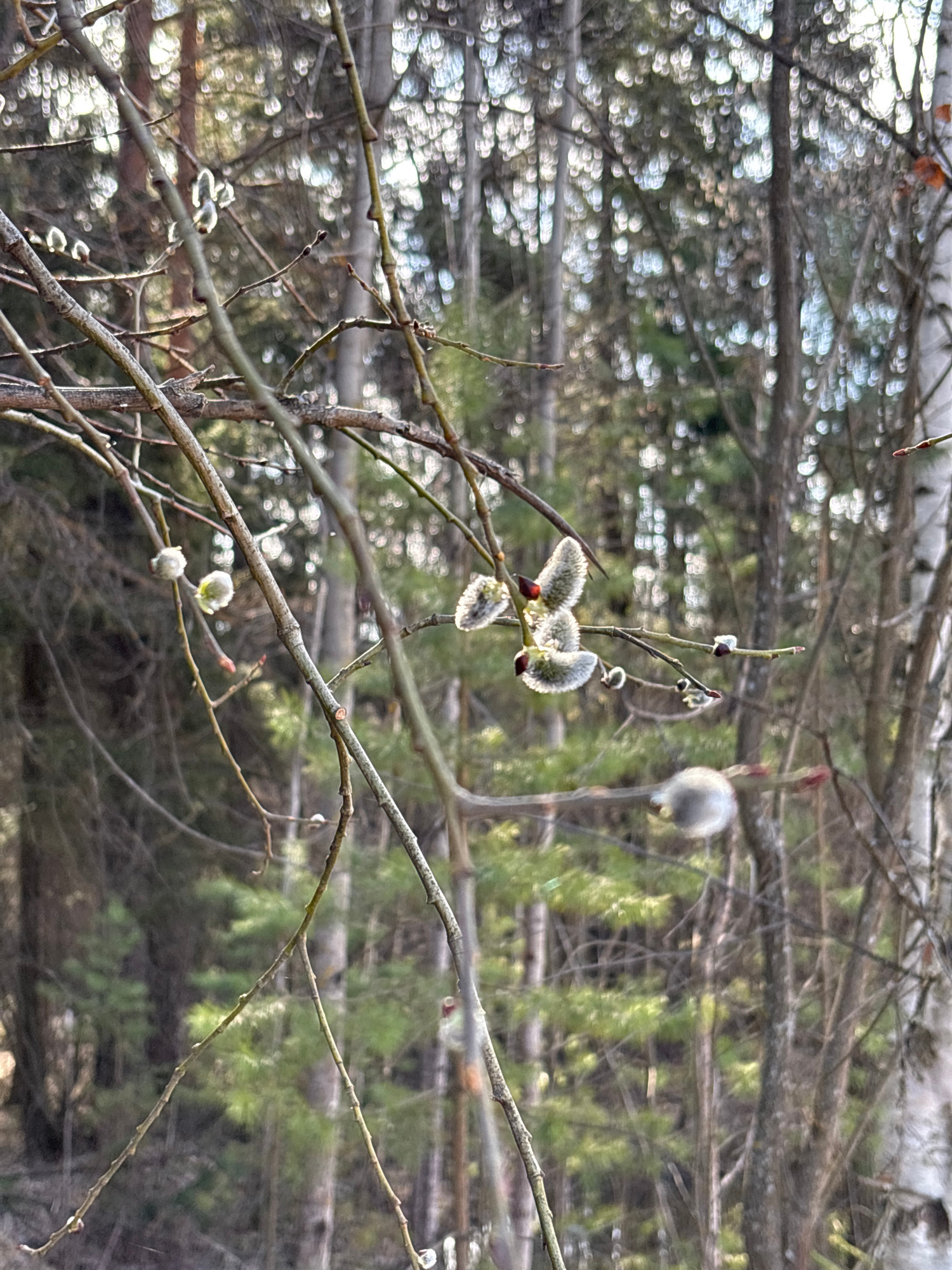 The image captures a close-up view of budding willow branches in what appears to be an early spring setting in Русский Вожой, Russia. The primary subjects are several slender, bare branches adorned wi…read more