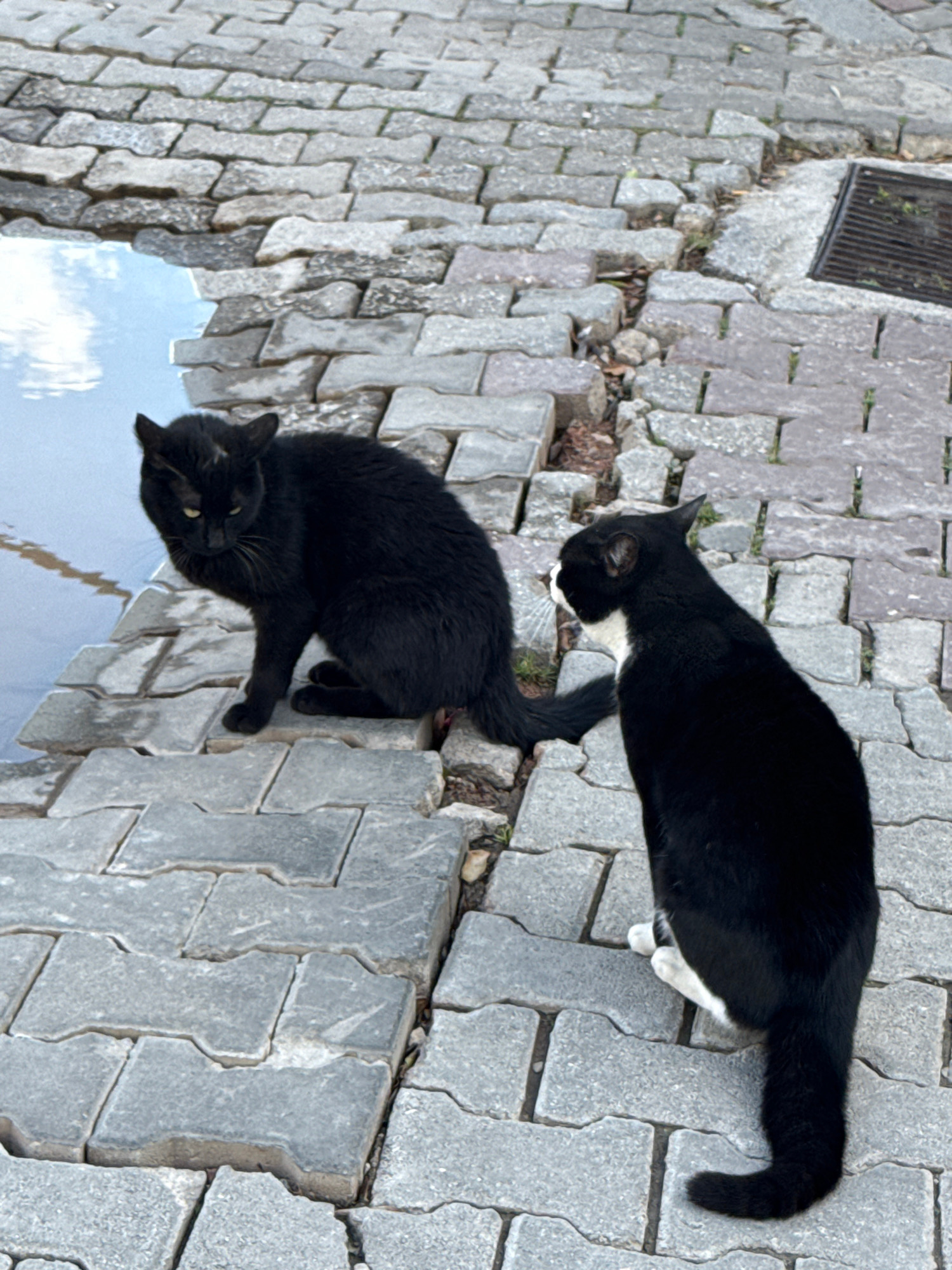 Two cats, one solid black and one black and white, are on a stone walkway. The cats are near a water feature with reflections of the sky. The walkway is made of interlocking concrete pavers. The scene…read more