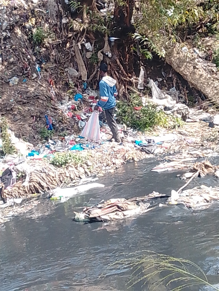 The image depicts a severely polluted riverbank and a dark, turbid river in an urban or semi-urban area of Nairobi, Kenya. The precise location within the city is not discernible from the visual infor…read more