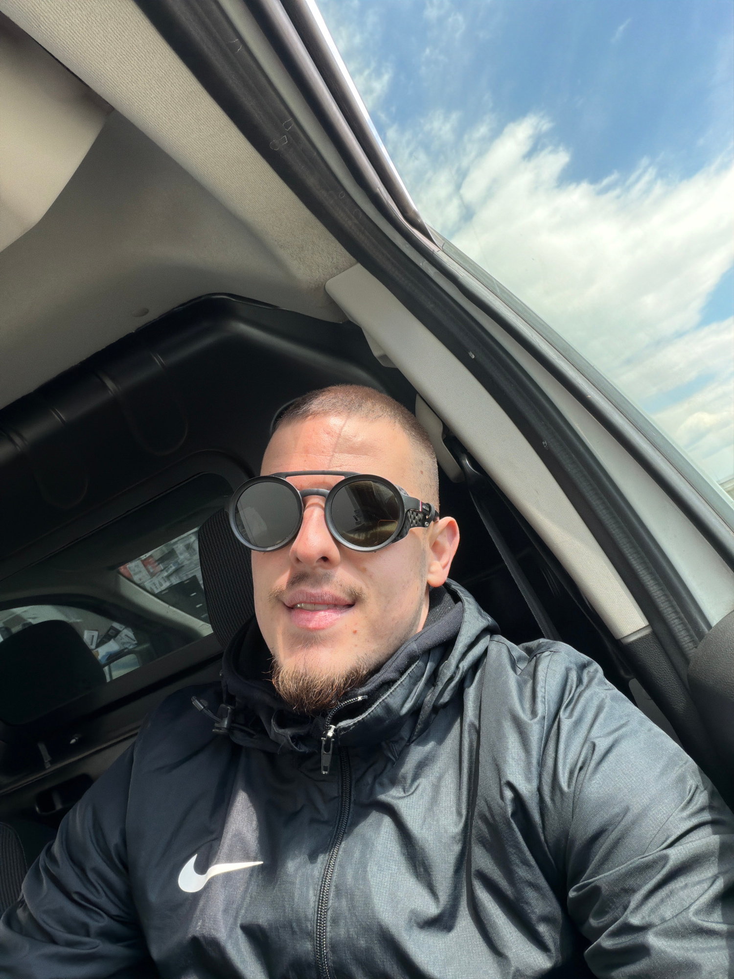 A man with short hair, a beard, and round sunglasses is inside a vehicle. He is wearing a black hooded jacket with a white Nike logo. The interior of the vehicle is visible, along with a view of the s…read more