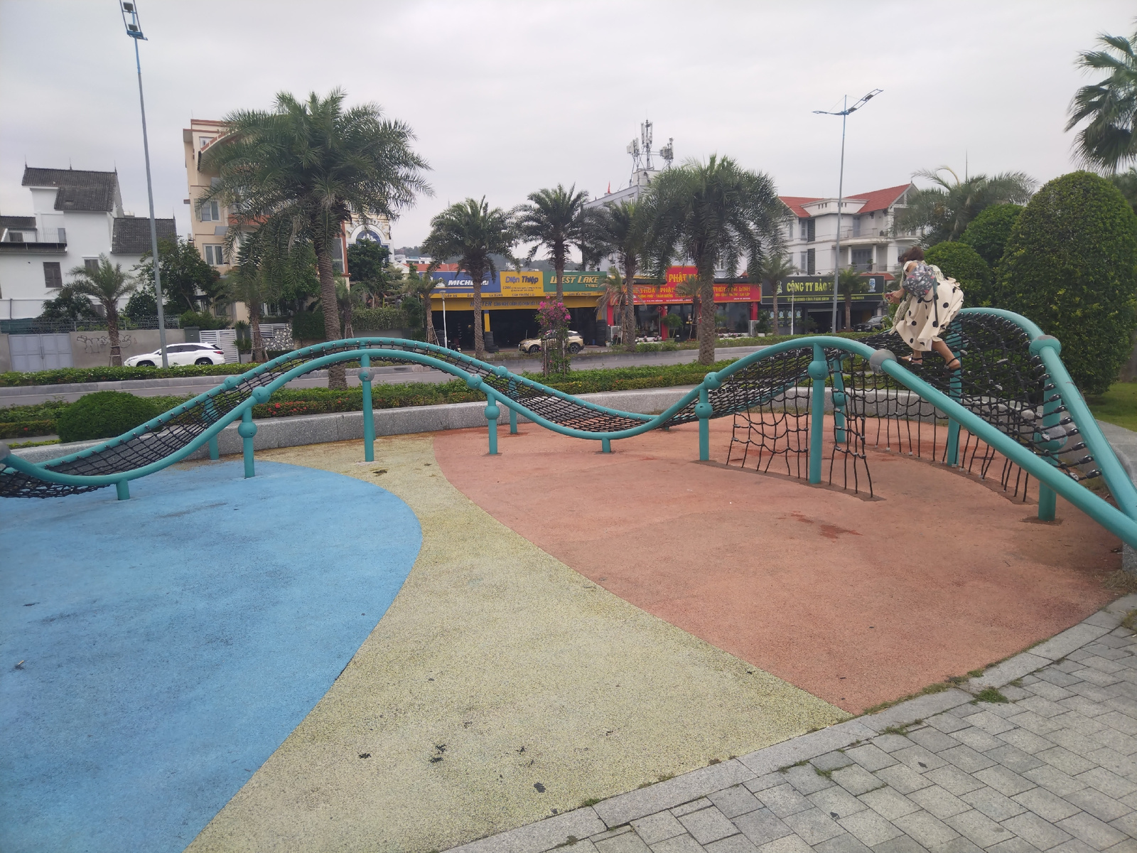The image depicts a playground in the city of Ha Long Ward, Vietnam. A young girl in a light-colored, polka-dotted dress and sandals is climbing on a play structure featuring teal-colored support pole…read more