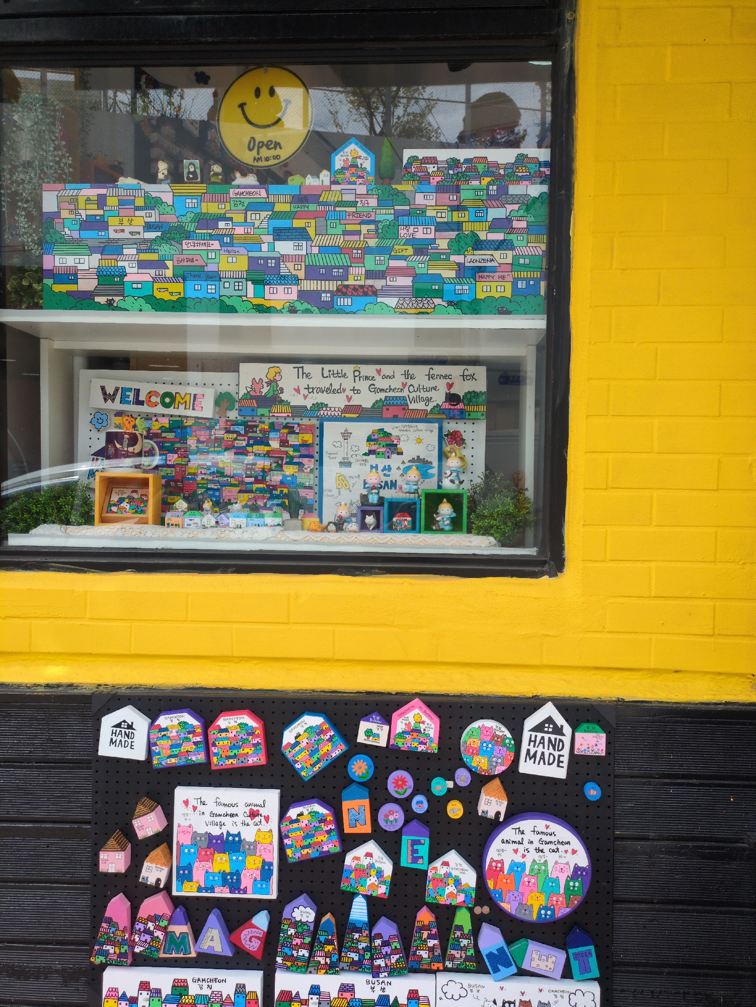 The image shows a shop front in Busan, South Korea. The shop has a yellow brick wall and a black, wooden door. The window is decorated with colorful drawings of houses and buildings, along with an "Op…read more