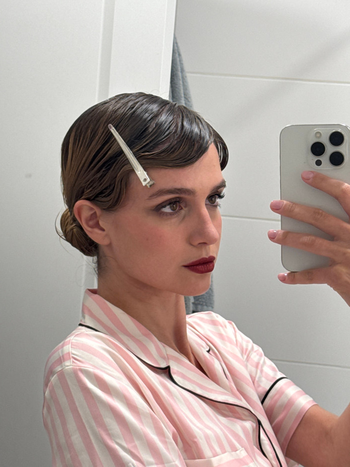 Location: Indoors, likely a bathroom or dressing area within a private residence in Unknown, Unknown. Scene Description: A female-presenting individual is depicted in a close-up, chest-up selfie capt…read more
